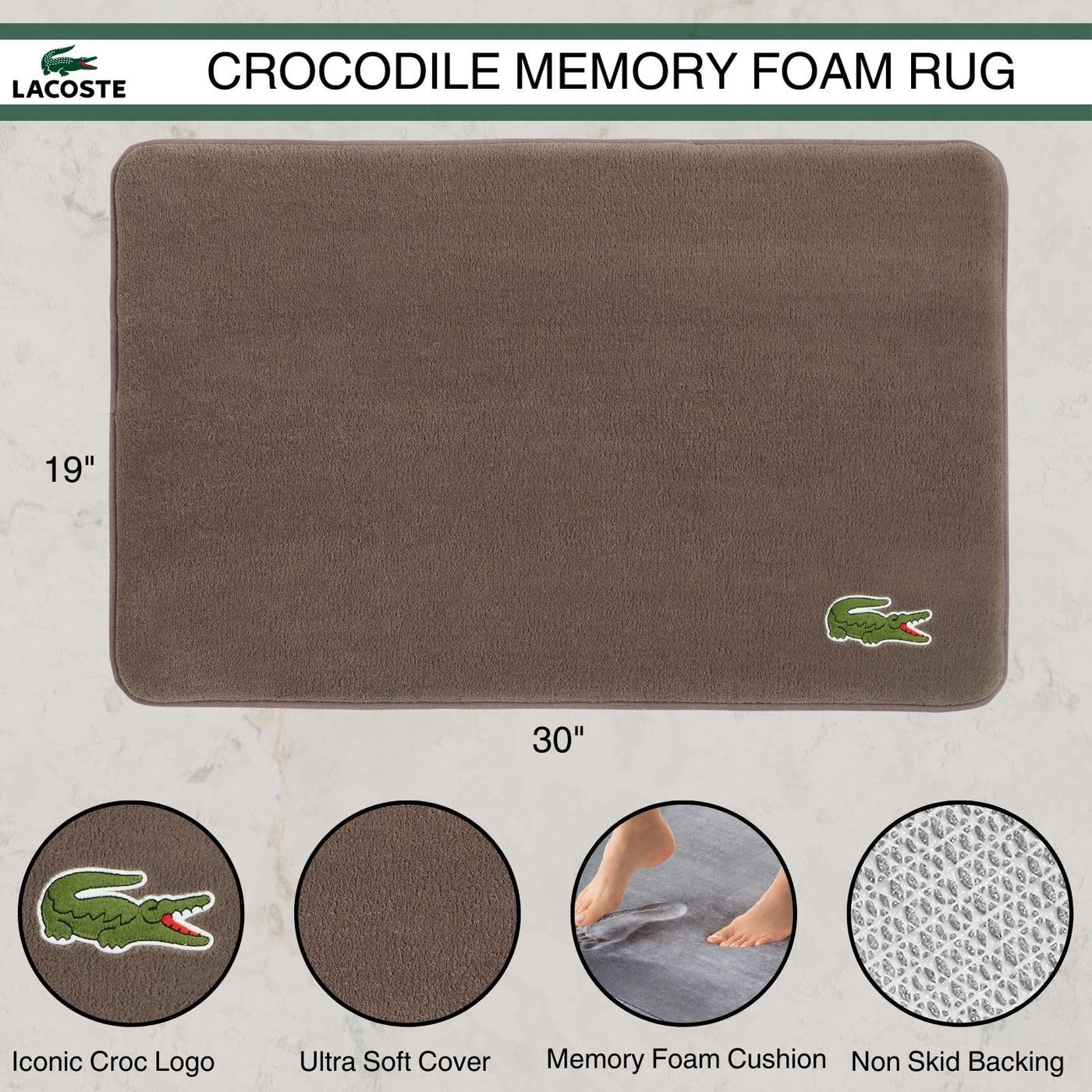 • Q: What material is the Lacoste Crocodile Rug made from? A: The specific material of the Lacoste Crocodile Rug is not provided, but it features a velvety soft surface and a thick memory foam cushioning.