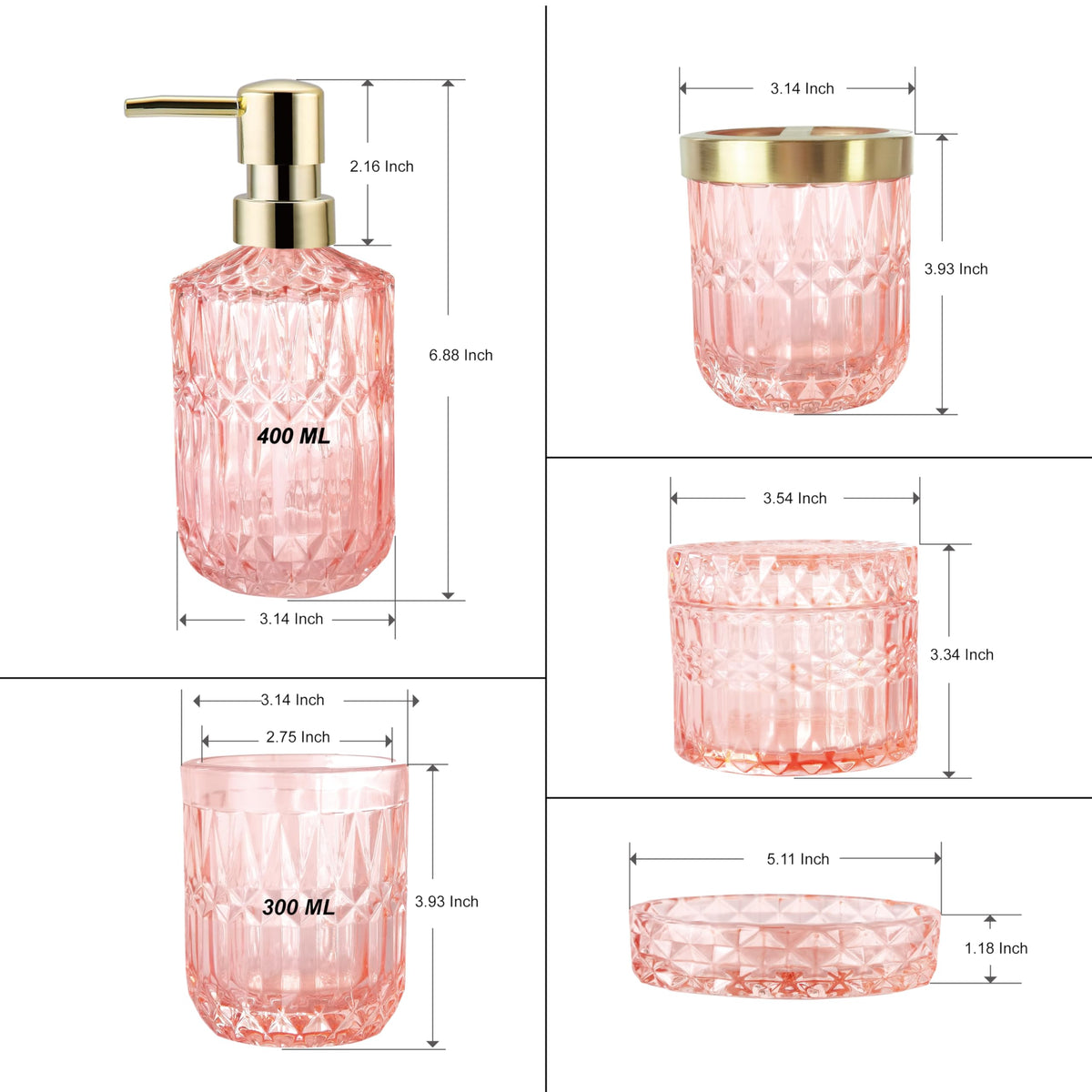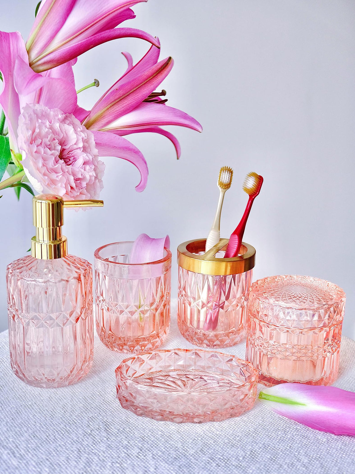 Lamarriti Pink Bathroom Accessories, 5Pcs Glass Bathroom Accessories Set, Soap Dispenser Set, Soap Dish, Tumbler, Cotton Swab Ja