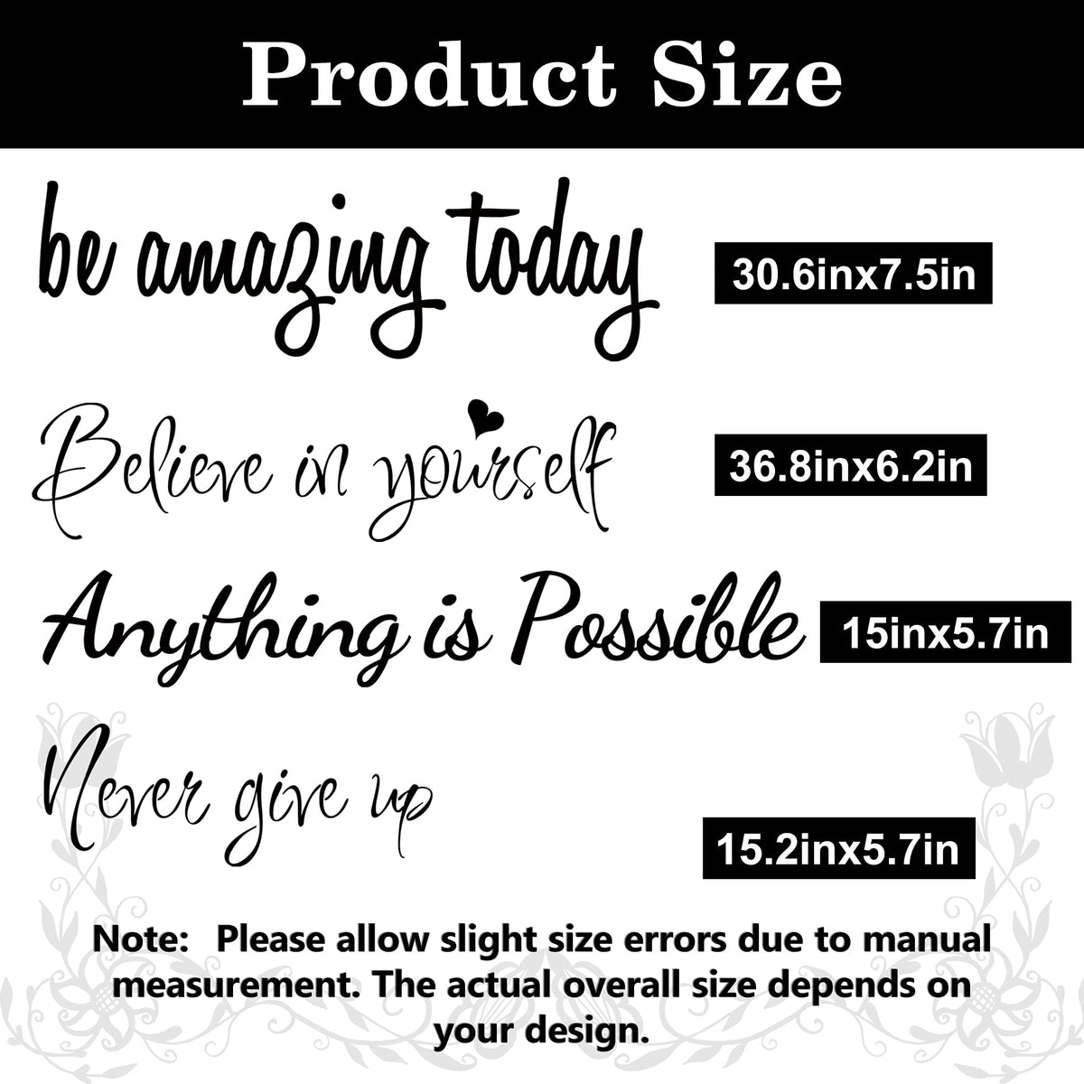 - Q: How many different words can I create with the decals? A: You can create up to twelve different words using the four big size stickers. The words can be positioned freely for customization.