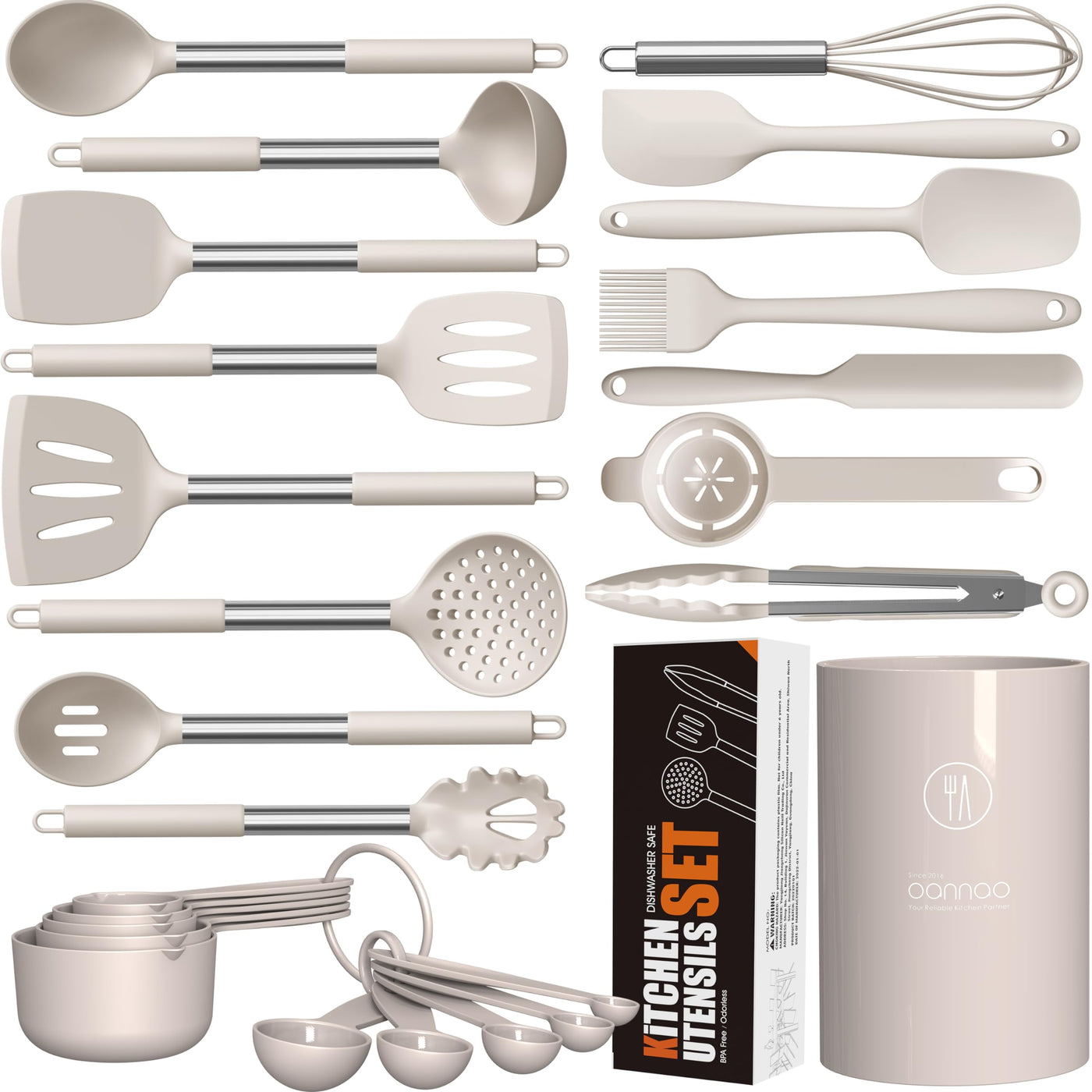 - Q: What types of utensils are included in the set? A: The set includes a variety of utensils such as a slotted turner, solid turner, deep soup ladle, pasta server, flexible spatula, spoon spatula, and more.