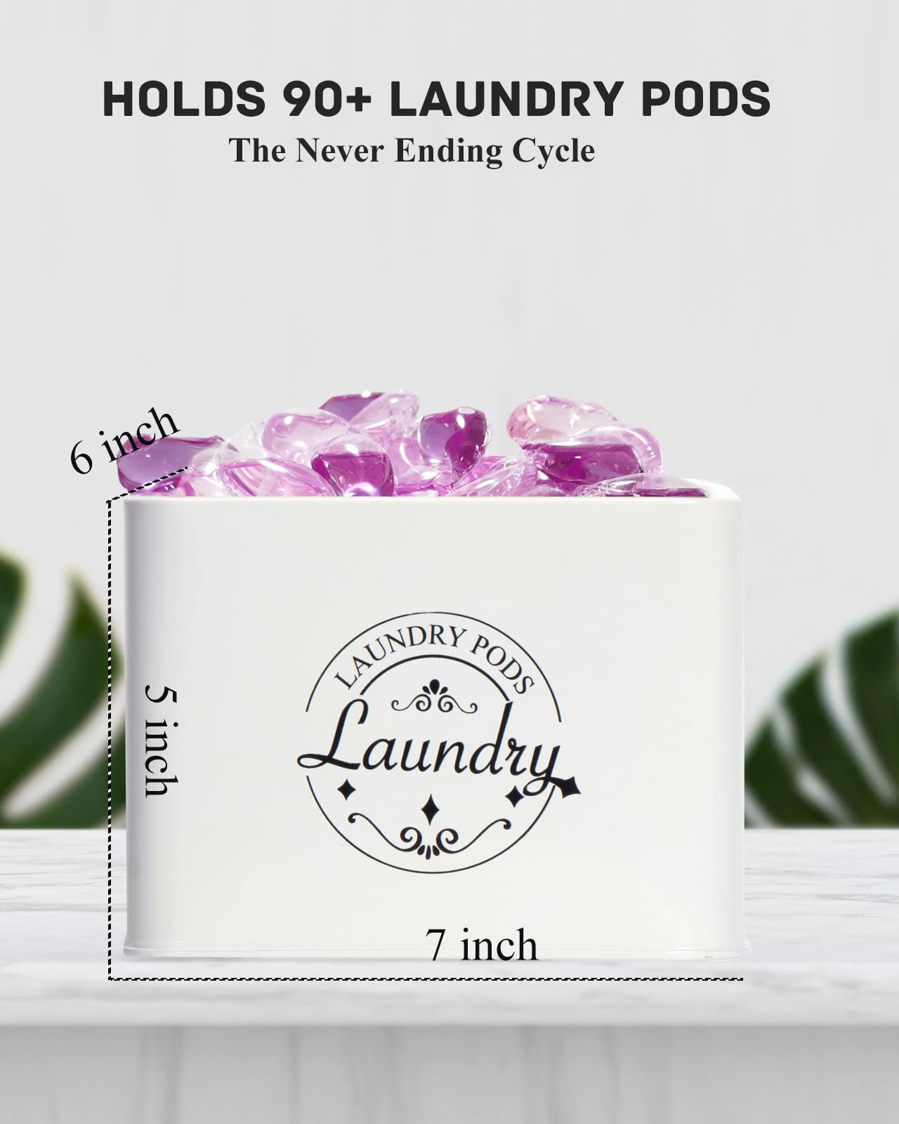 - Q: What are the dimensions of the Laundry Pods Container? A: The Laundry Pods Container measures 7 inches in height, 6 inches in width, and 5 inches in depth.