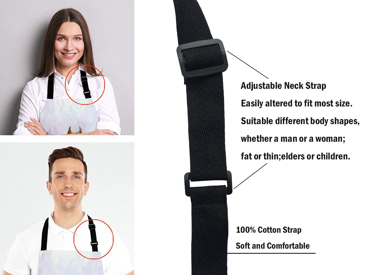 - Q: Does the apron have an adjustable neck strap? A: Yes, the apron features an adjustable neck strap that allows for quick adjustments to fit different heights comfortably.