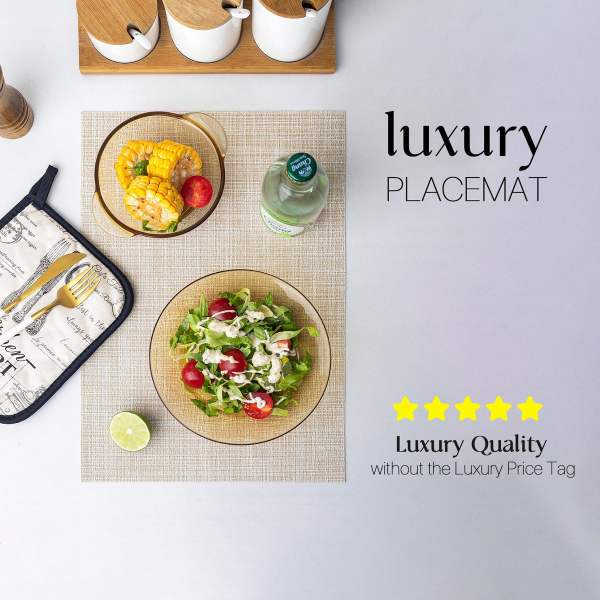 • Q: Do these placemats come in different colors? A: This specific set comes in a beige and white color scheme, which is neutral and versatile for various dining decors.