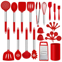 - Q: What is included in the LIANYU 27 PCS Kitchen Utensils Set? A: The LIANYU 27 PCS Kitchen Utensils Set includes a skimmer, soup ladle, turner, slotted turner, large slotted turner, spoon, slotted spoon, spaghetti server, tong, whisk, spatula, spreader spatula, basting brush, multi-purpose grater, 2 oven mitts, 5 measuring cups, 5 measuring spoons, and a utensil holder.