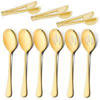 - Q: What is included in the LIANYU 9-Piece Serving Utensils Set? A: The set includes 3 gold serving spoons, 3 gold slotted serving spoons, and 3 gold serving tongs, all measuring 9.8 inches for the spoons and 9.4 inches for the tongs.