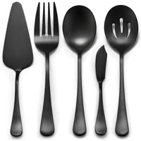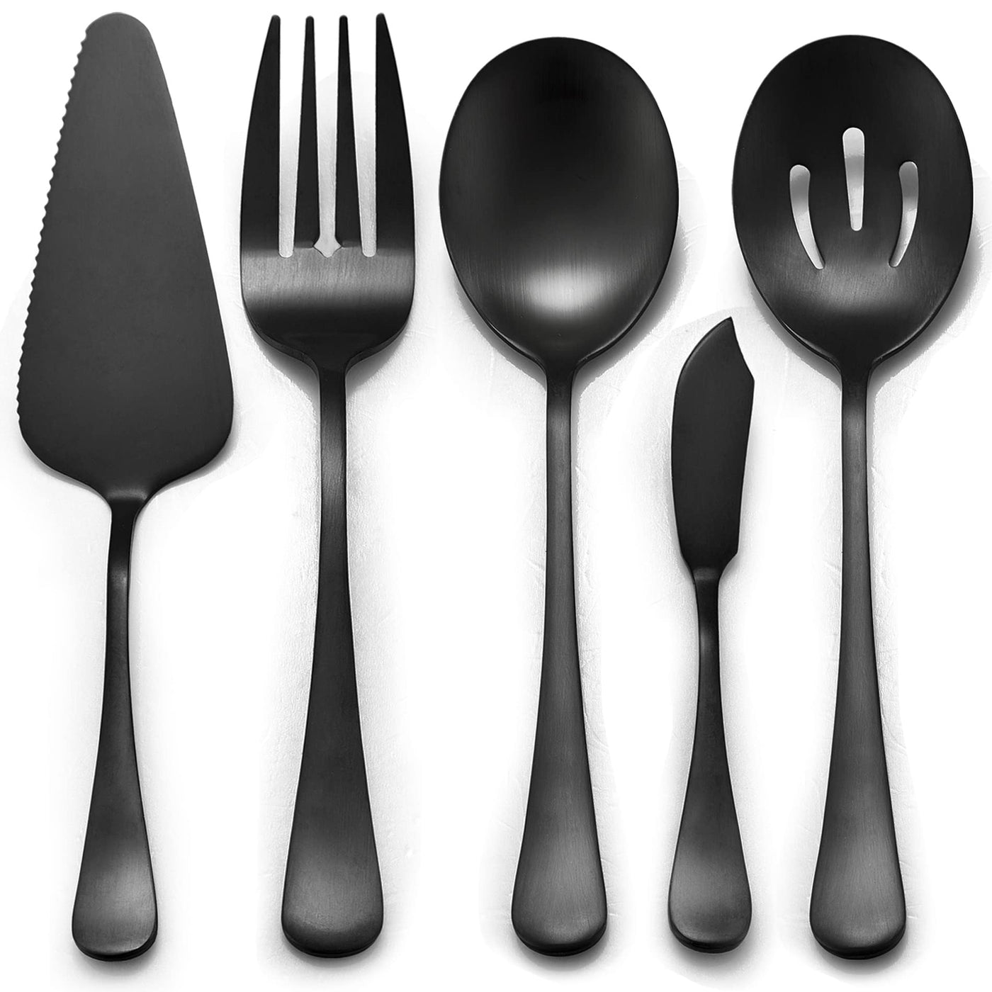 - Q: What utensils are included in the LIANYU 5-Piece Matte Black Serving Utensils Set? A: The set includes a butter spreader, serving spoon, serving fork, cake server, and slotted serving spoon.