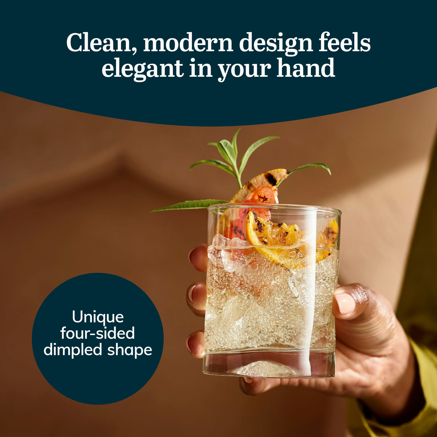 • Q: What is the design of the glasses? A: The glasses feature a unique four-sided dimpled design that offers an easy grip and adds a modern touch.