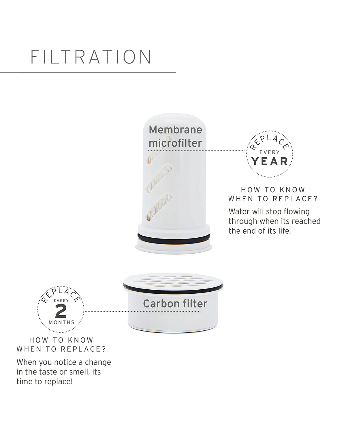 • Q: How long does the filter last? A: The membrane microfilter lasts approximately 264 gallons or about one year, while the activated carbon and ion exchange filter lasts around 40 gallons, equating to roughly two months.