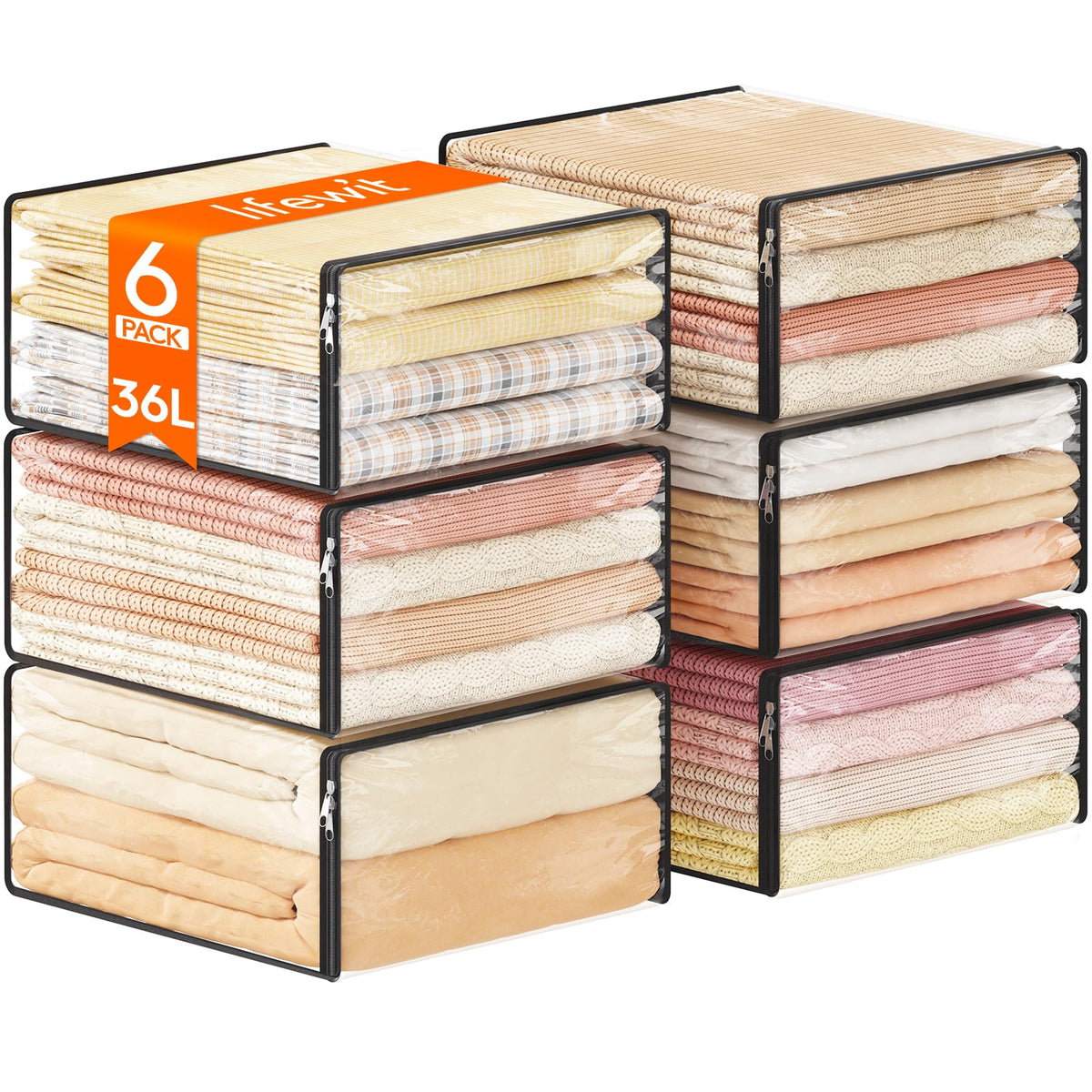 Lifewit 36L Clear Sheet Storage Bags with Zipper 6 Pack, Plastic Sweater Storage Bins for Clothing, Vinyl Foldable Clothes Conta