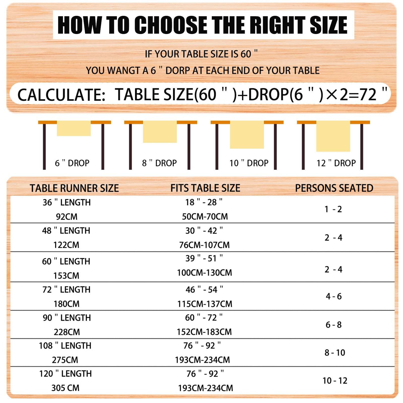 • Q: What are the dimensions of the table runner? A: The table runner measures 13 inches by 72 inches, making it suitable for tables that can seat 4 to 6 people.