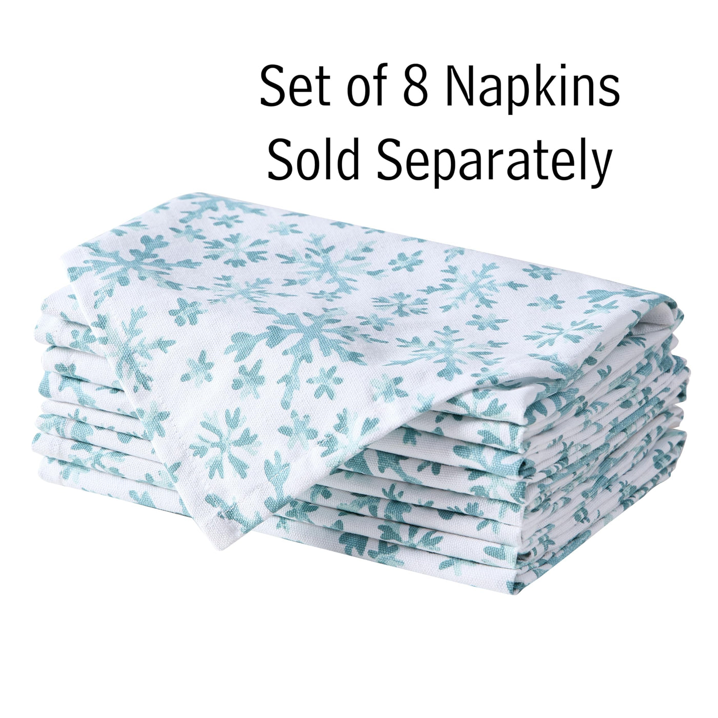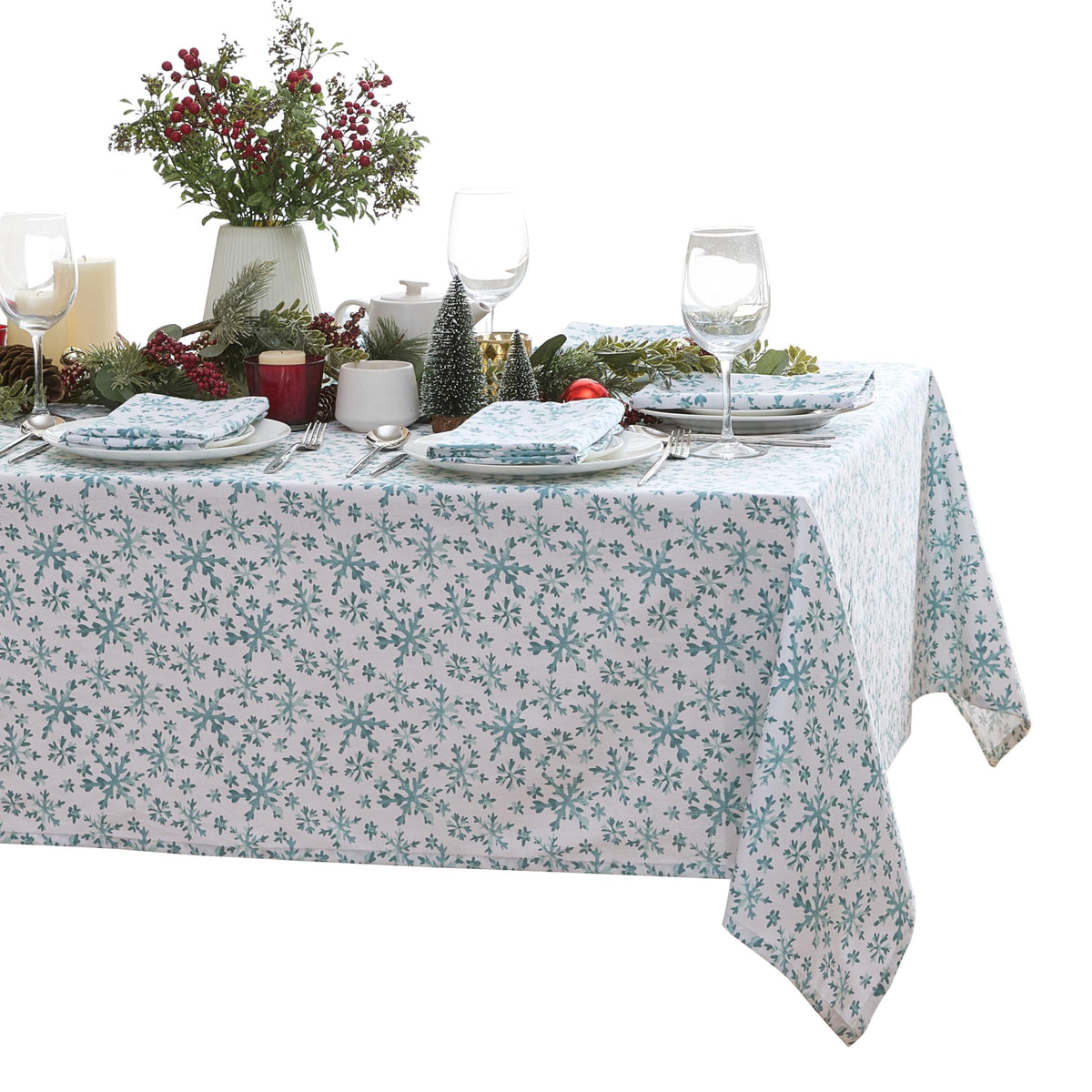 - Q: What style does the tablecloth feature? A: The tablecloth features a casual style with an all-over design of blue crystalized snowflakes on a crisp white background, perfect for holiday dining.
