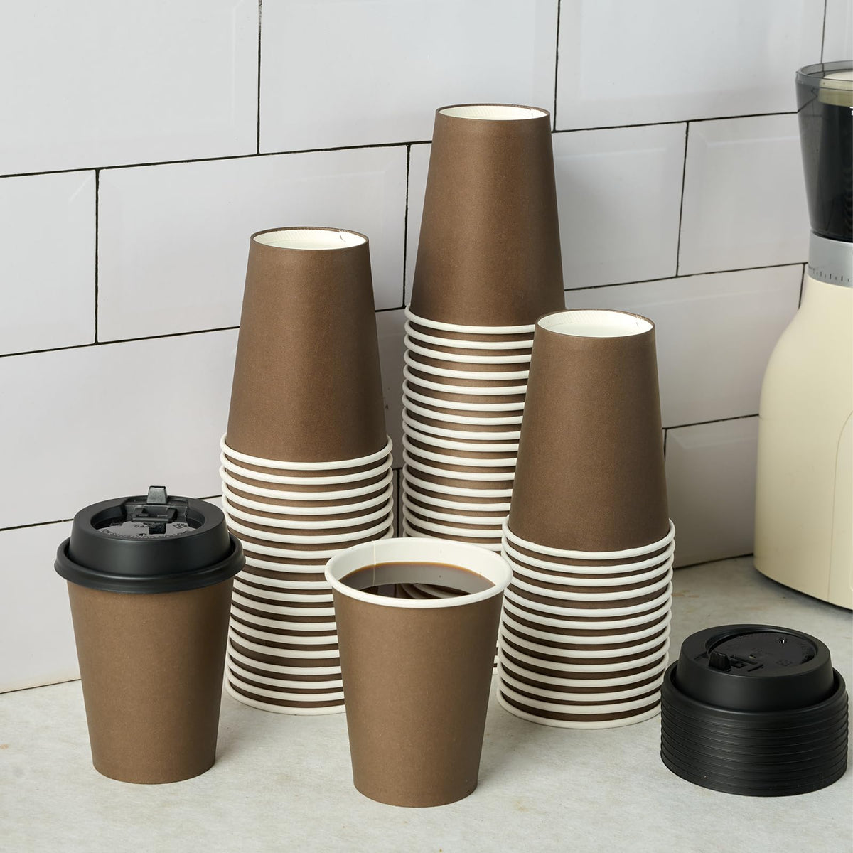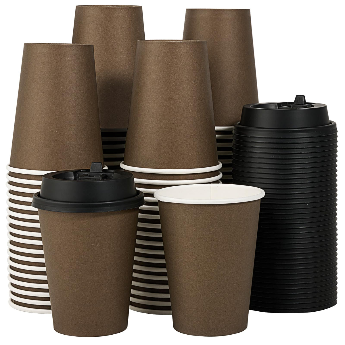 - Q: How many cups are included in this pack? A: The pack includes 100 disposable 12 oz brown paper coffee cups along with 100 black lids.