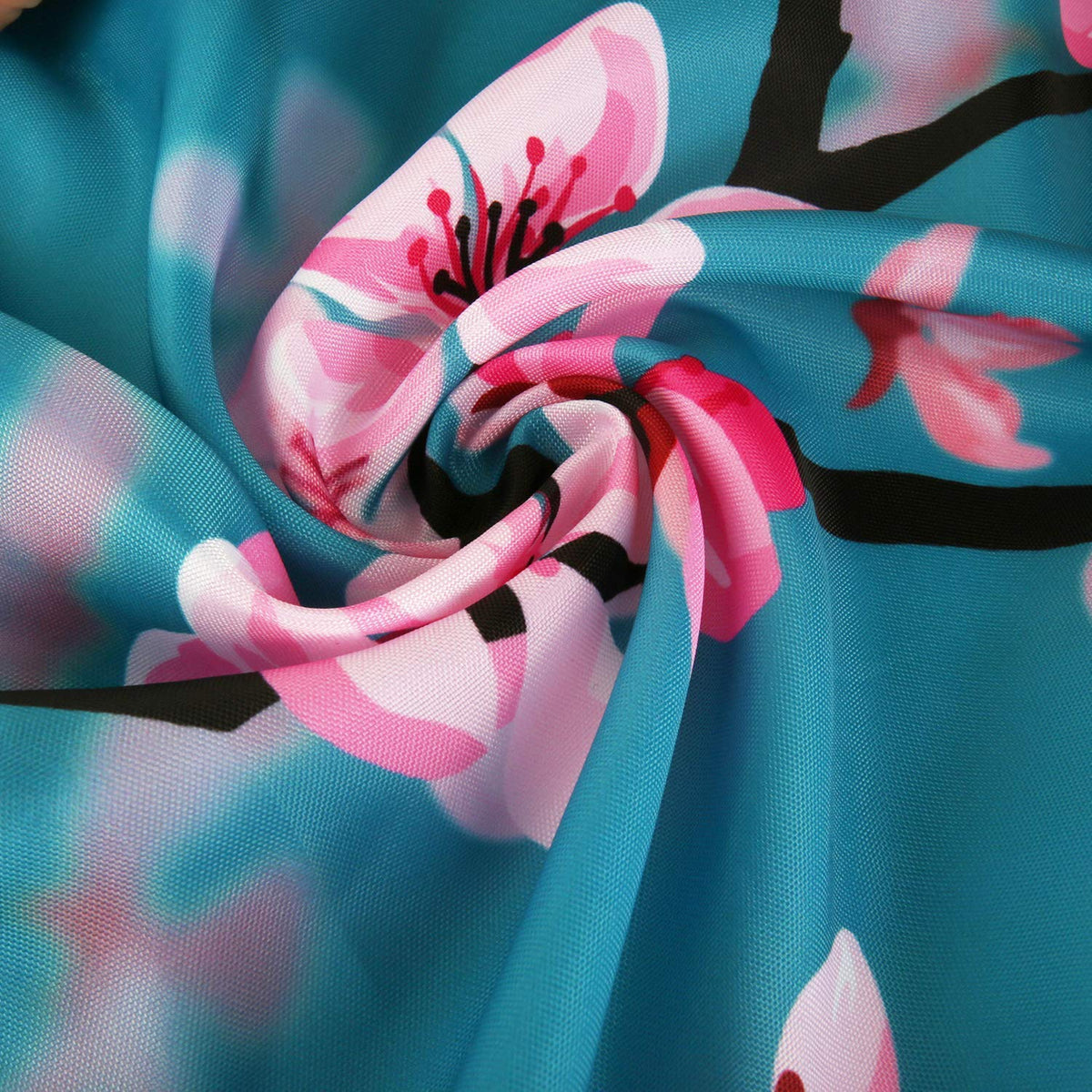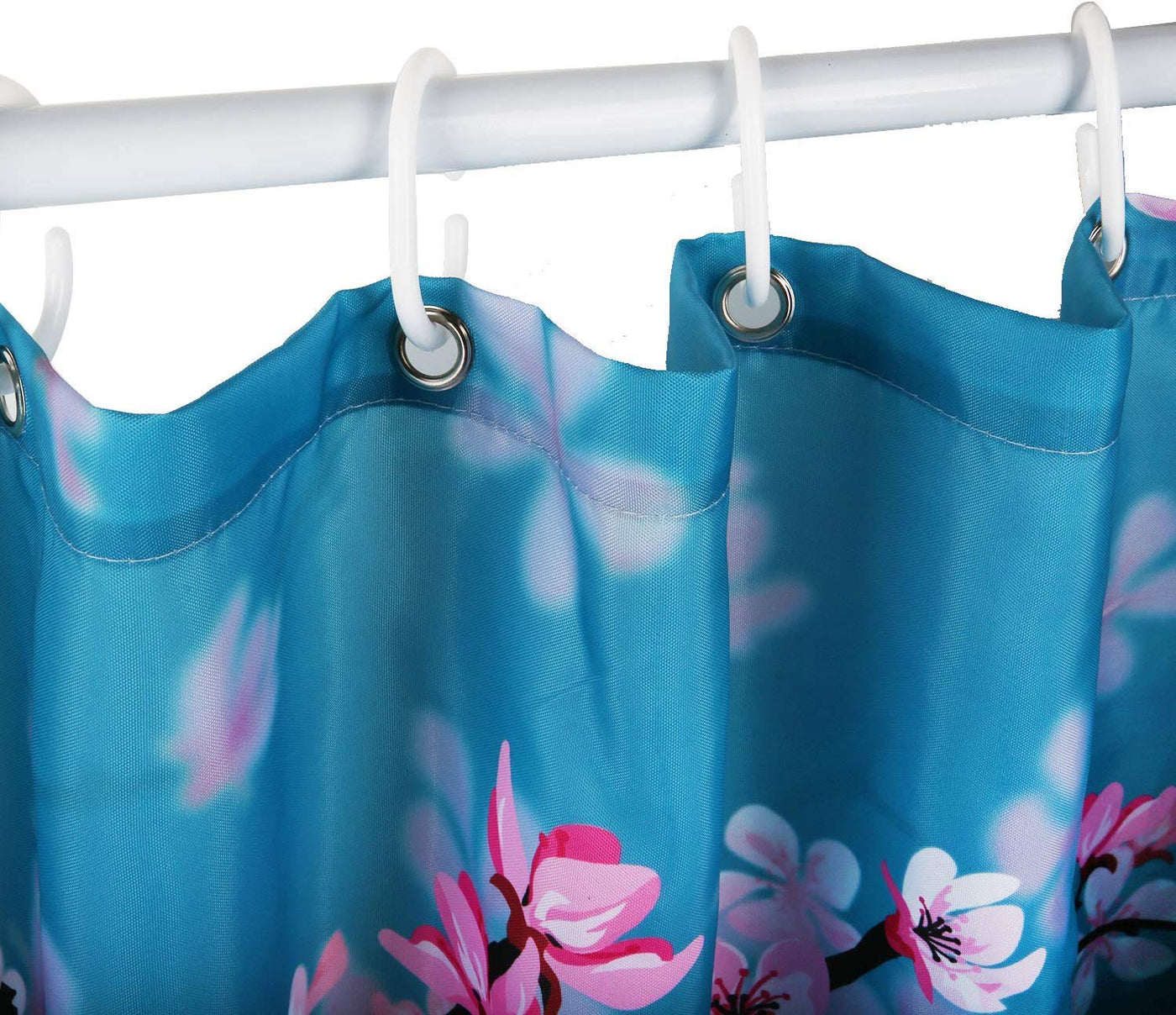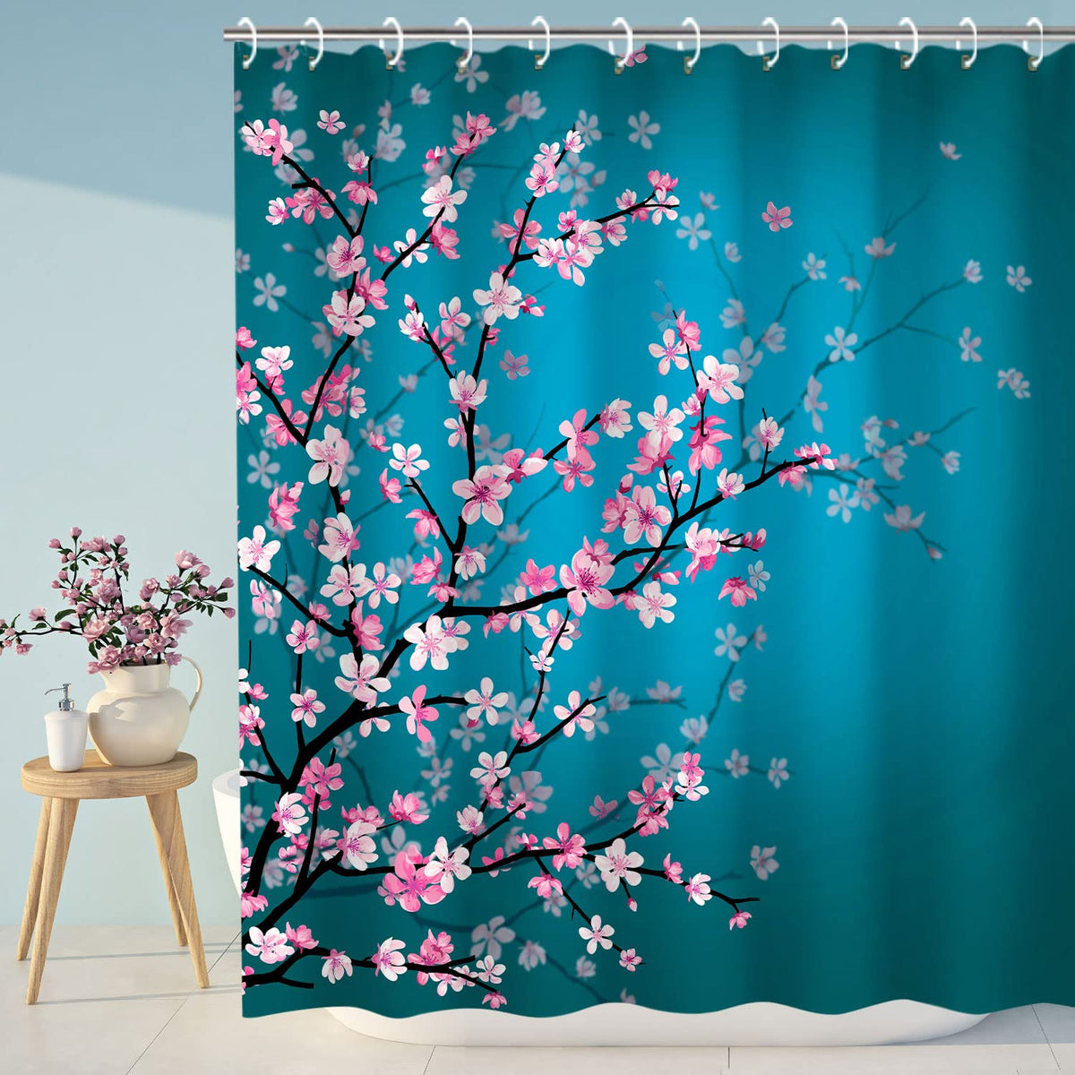 - Q: What color options are available for this shower curtain? A: The LIVILAN Cherry Blossom Shower Curtain features a combination of teal blue and pink colors, providing a vibrant look.