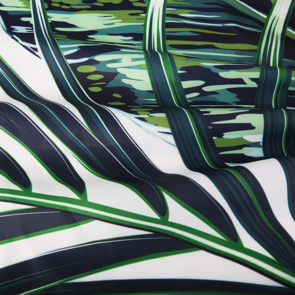 • Q: What is the overall design theme of this shower curtain? A: The overall design theme is tropical, featuring a botanical leaf pattern that evokes a jungle atmosphere.