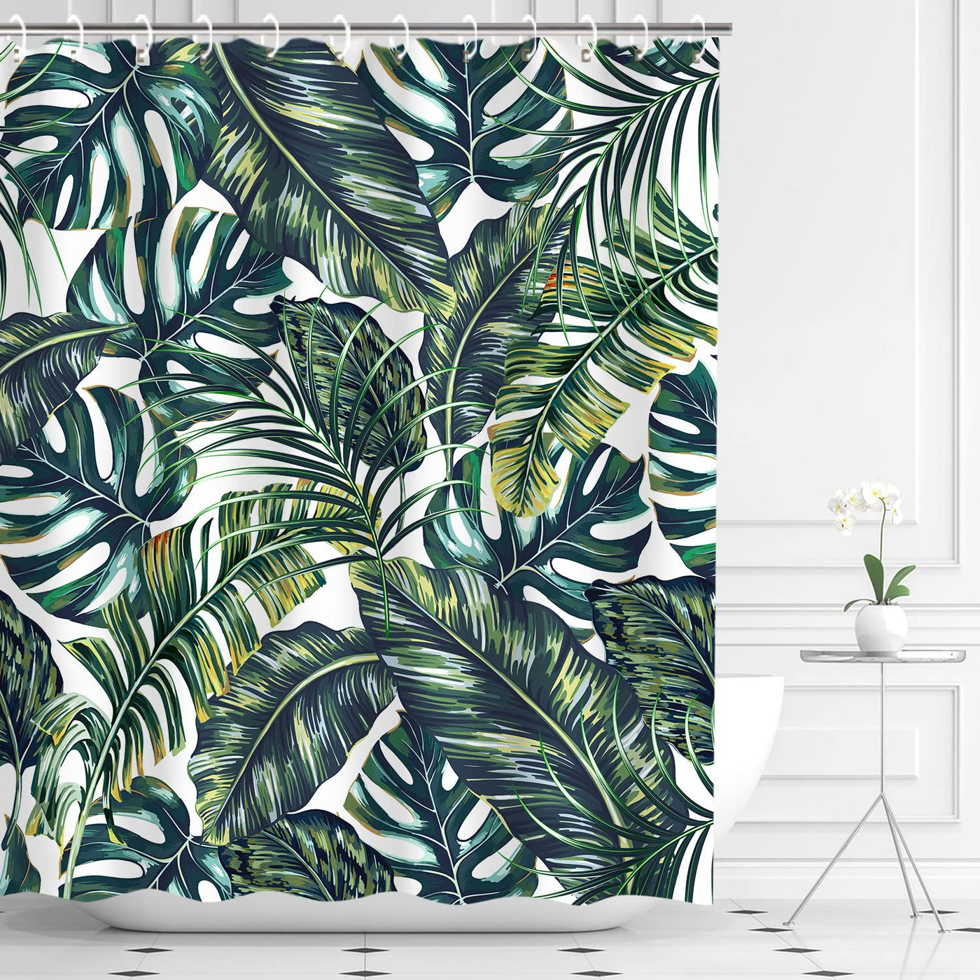 • Q: Can this shower curtain be used in any bathroom decor style? A: Yes, the tropical and botanical design of the shower curtain makes it suitable for various bathroom decoration styles.