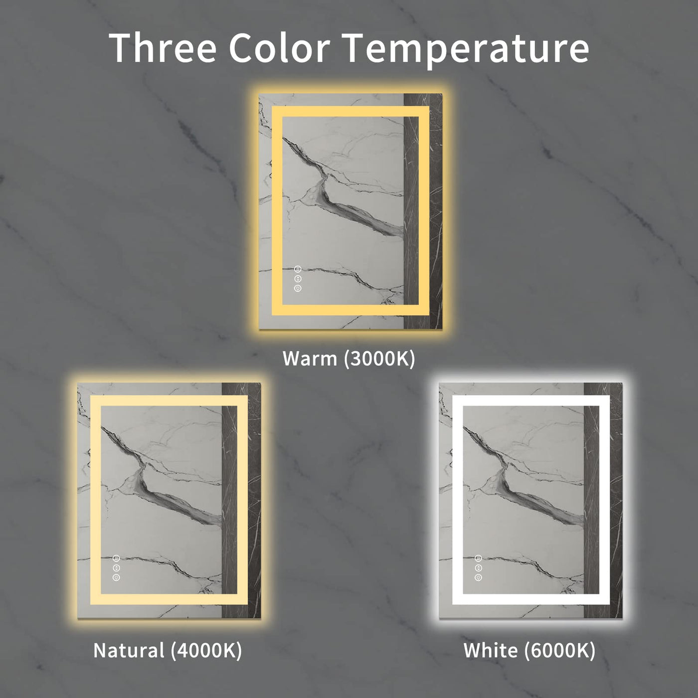 - Q: What are the light modes available? A: The mirror offers three light modes: warm light at 3000 Kelvin, natural light at 4000 Kelvin, and white light at 6000 Kelvin.
