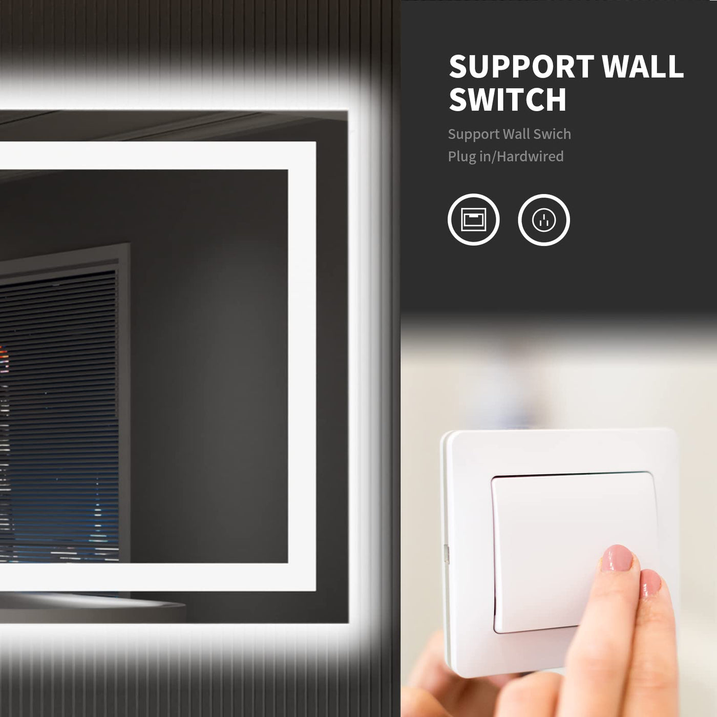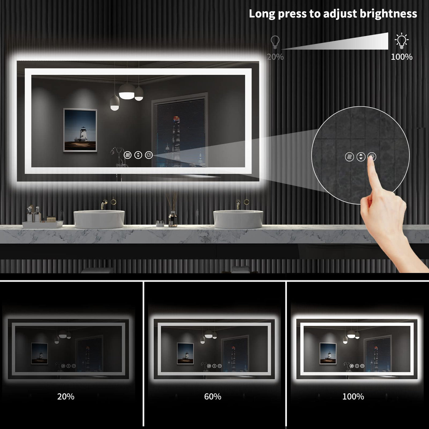 - Q: Can I adjust the brightness of the mirror? A: Yes, the mirror is dimmable. You can long press the touch switch to adjust the brightness from 20% to 100%.