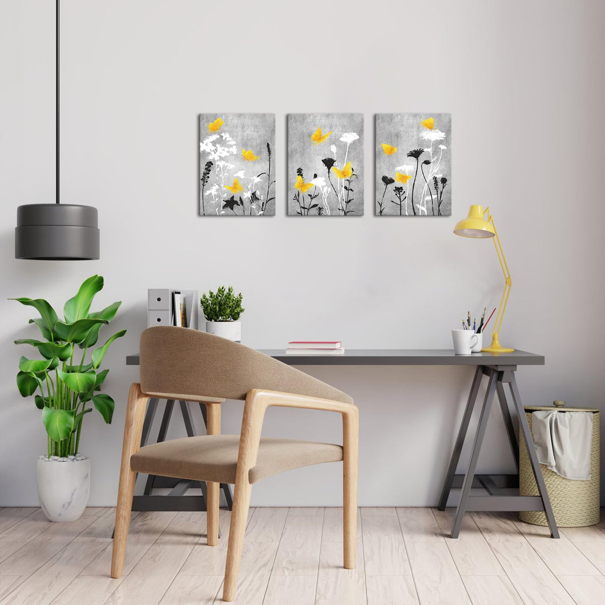 - Q: What are the dimensions of the LoveHouse Yellow and Grey Bathroom Flower Wall Art? A: The wall art consists of three pieces, each measuring 12 inches by 16 inches, making the total size 12 inches by 48 inches when displayed together.