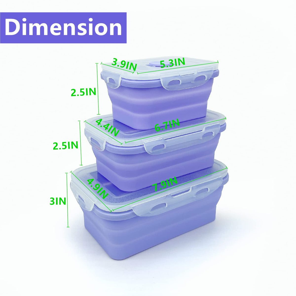 • Q: What are the dimensions of the Lunbengo collapsible meal prep containers? A: The Lunbengo collapsible meal prep containers come in three sizes: 350ml measures 5.3 x 3.9 x 2.5 inches, 500ml measures 6.7 x 4.4 x 2.5 inches, and 800ml measures 7.9 x 4.9 x 3 inches.