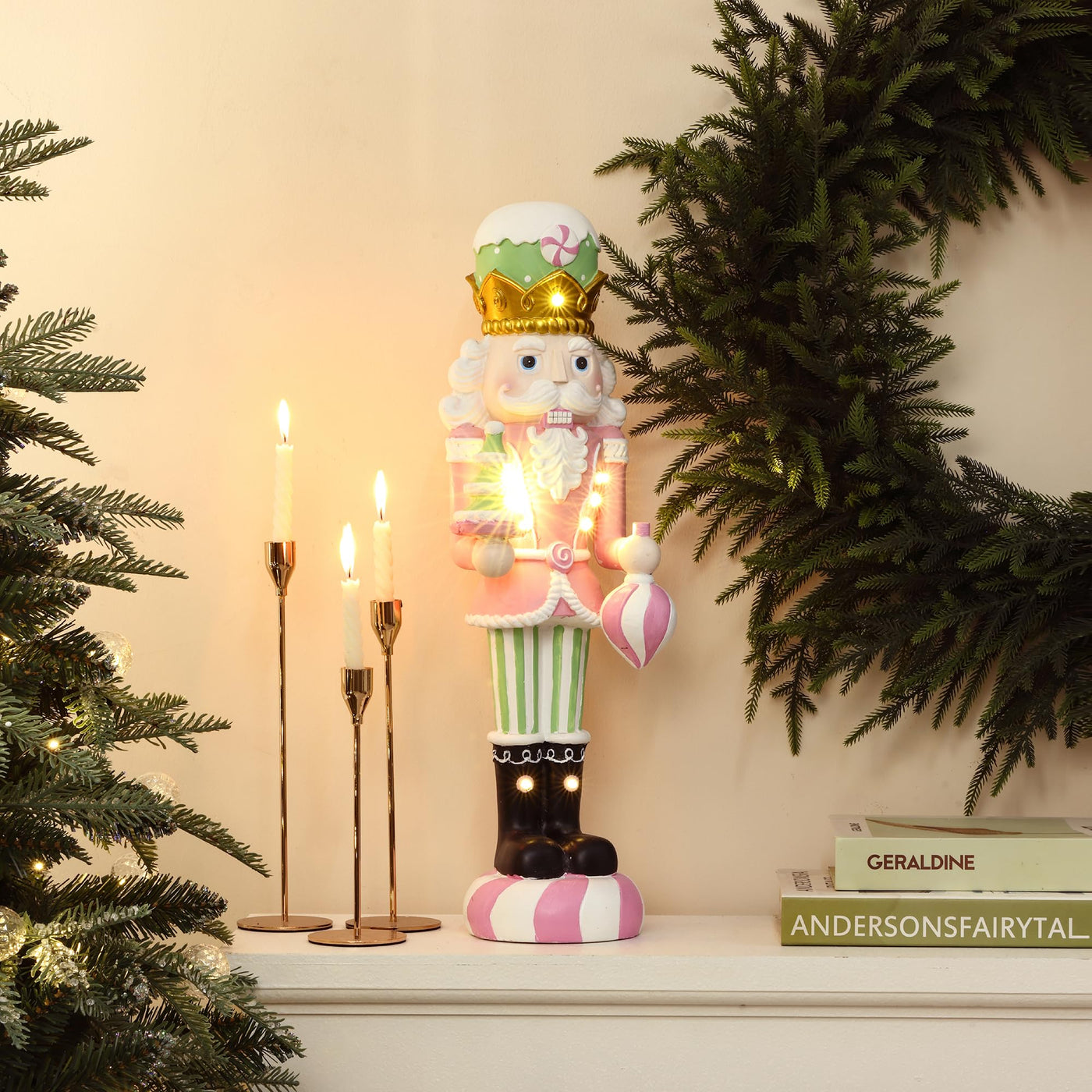 LuxenHome 2FT Tall Nutcracker Christmas Decoration, Candy Theme Large Nutcracker Soldier Decoration with Candy Tree, Lighted Chr