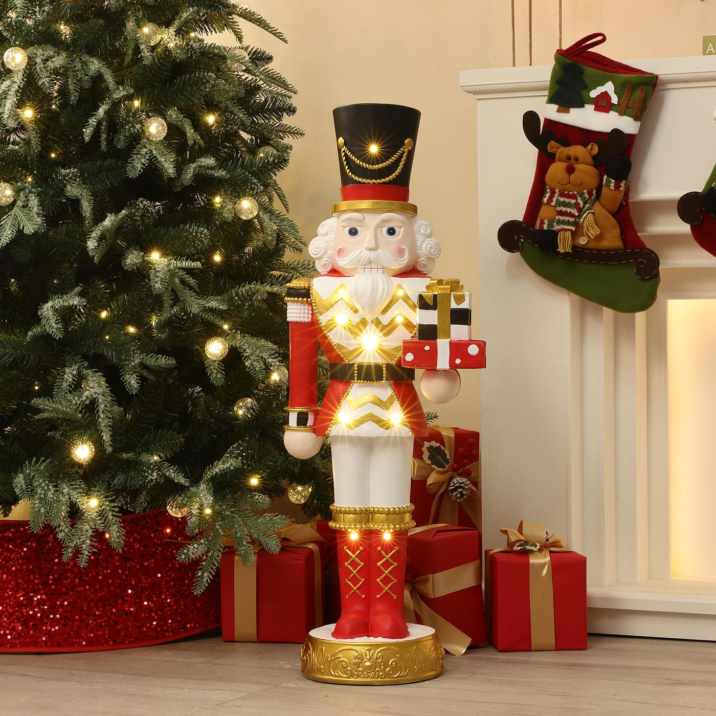 LuxenHome 3FT Tall Nutcracker Christmas Decoration, Large Holiday Nutcracker Soldier Statue with Gift Box, Lighted Figures Chris