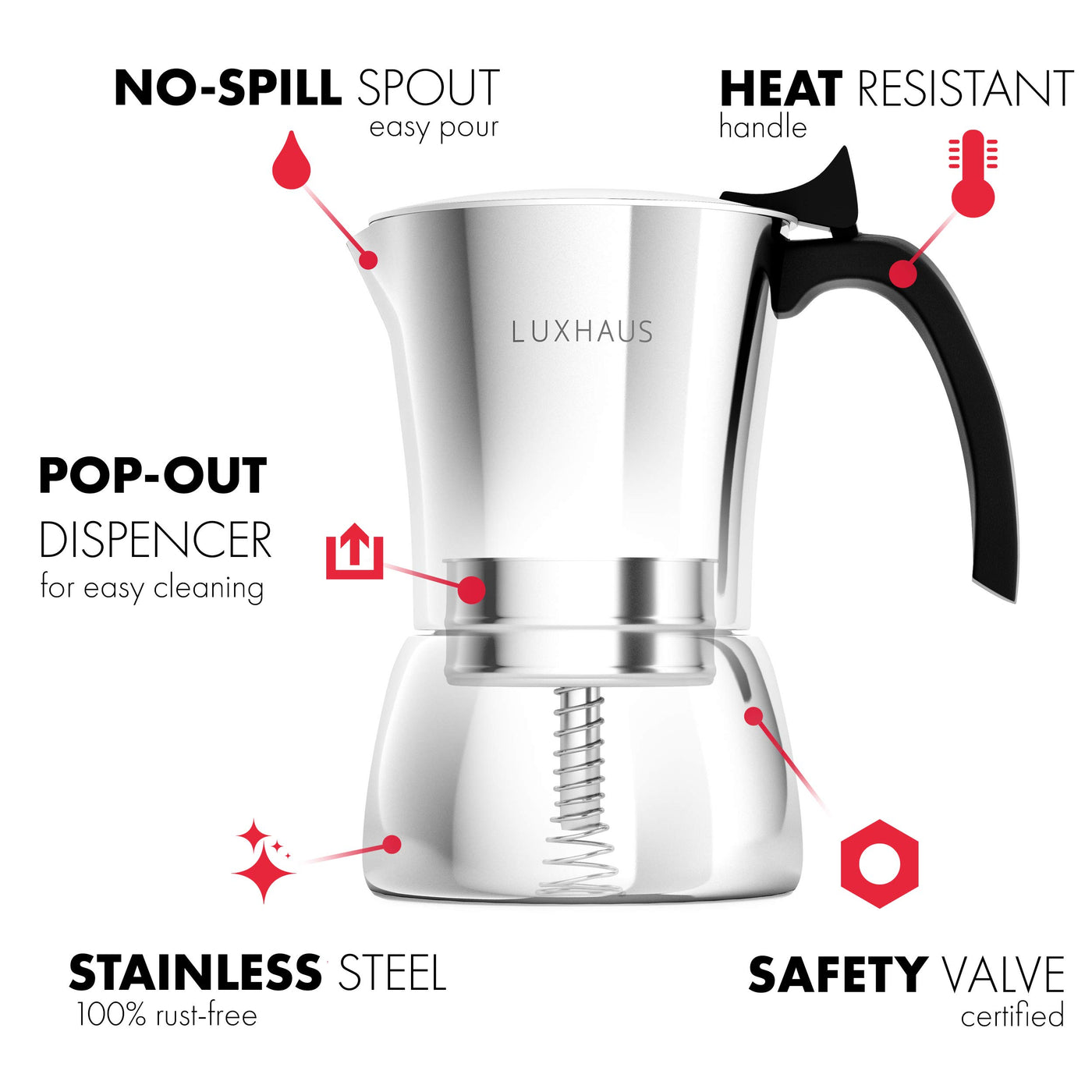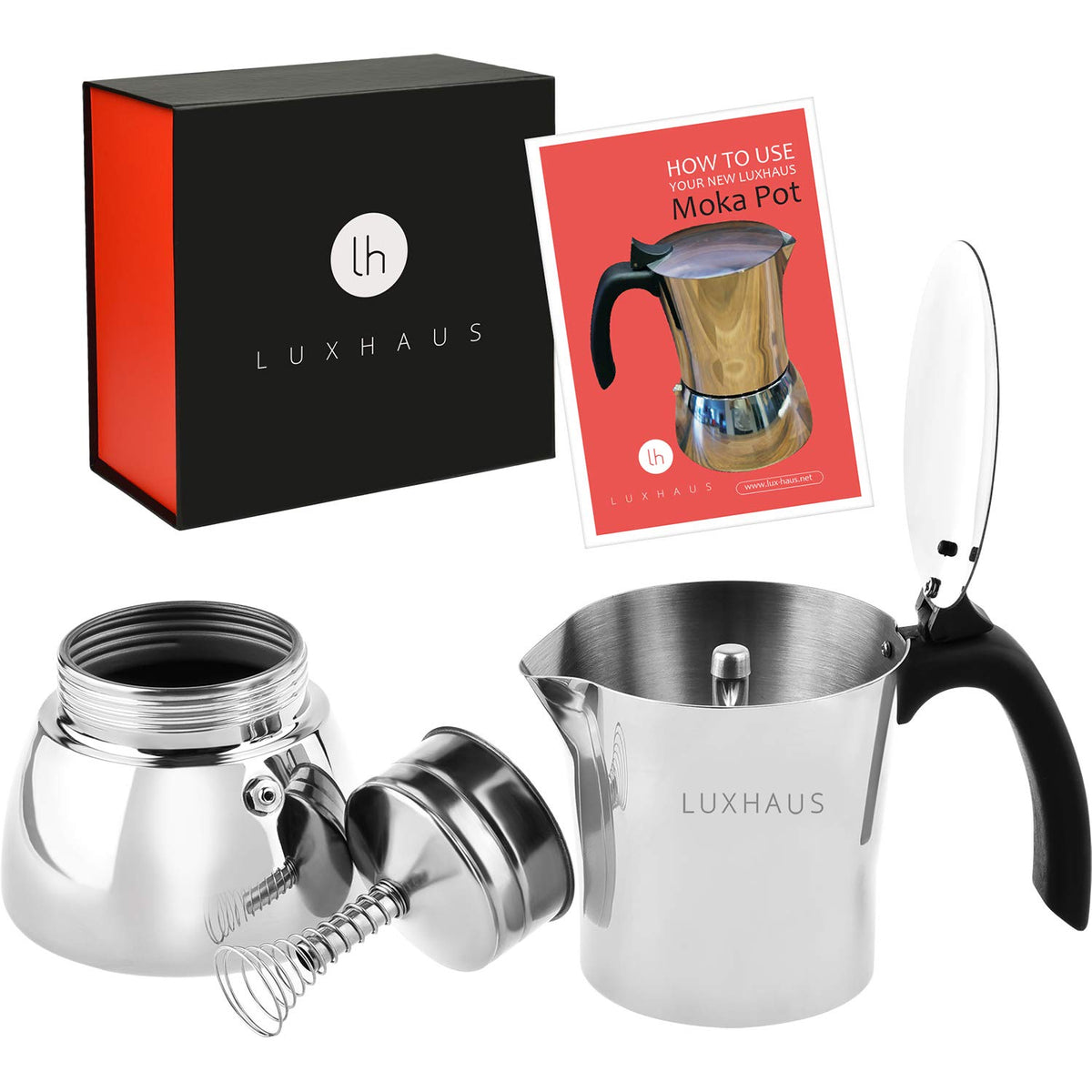 - Q: What material is the LuxHaus Moka Pot made from? A: The LuxHaus Moka Pot is made from 100% stainless steel, ensuring durability and resistance to rust.