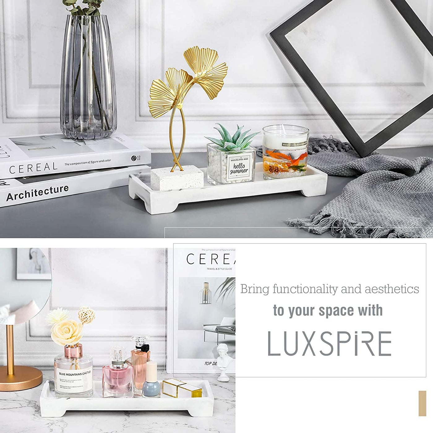 - Q: Can this tray be used in the bathroom? A: Yes, the Luxspire tray is designed for versatility and can be used in the bathroom for organizing soap dispensers, skincare products, and towels.