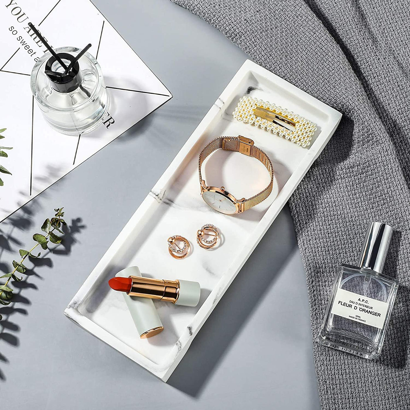 - Q: Can I use this tray for serving food or drinks? A: While the tray is functional for organizing items, it is primarily designed for decorative use and organizing bathroom or kitchen accessories rather than serving food or drinks.