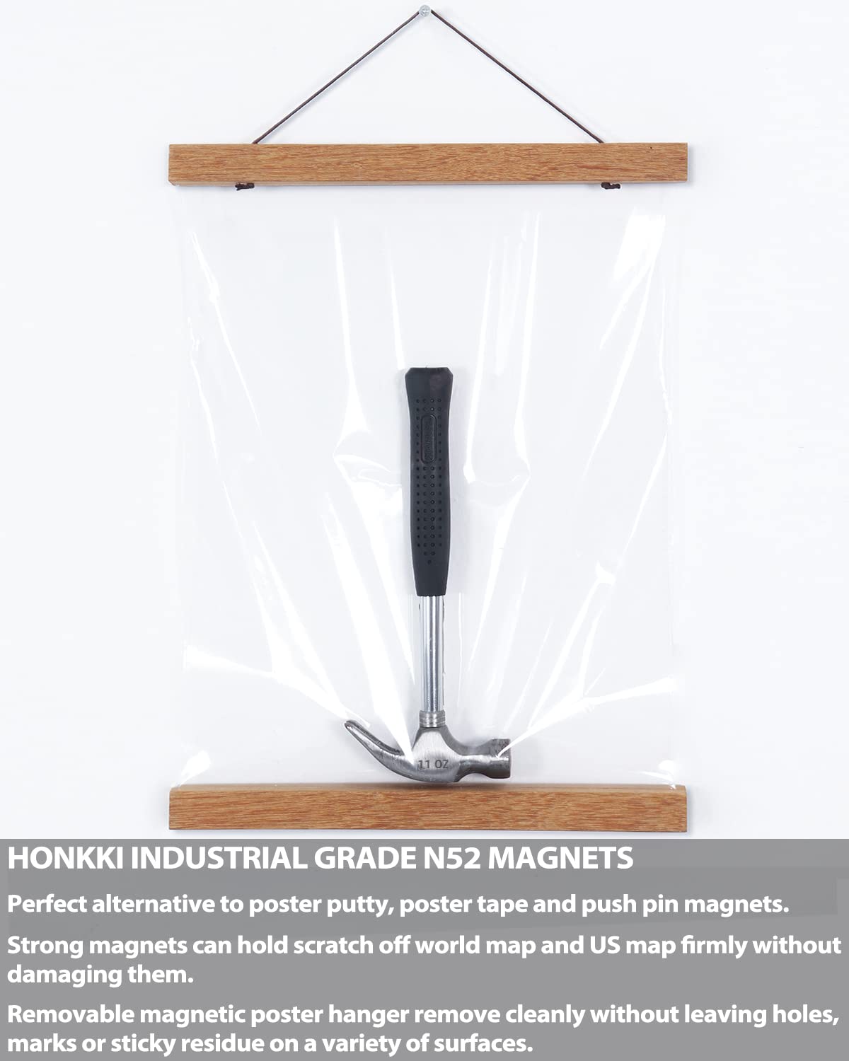 - Q: What type of magnets does this hanger use? A: The poster hanger features extra strong industrial-grade N52 magnets, ensuring it can hold posters of different weights securely.