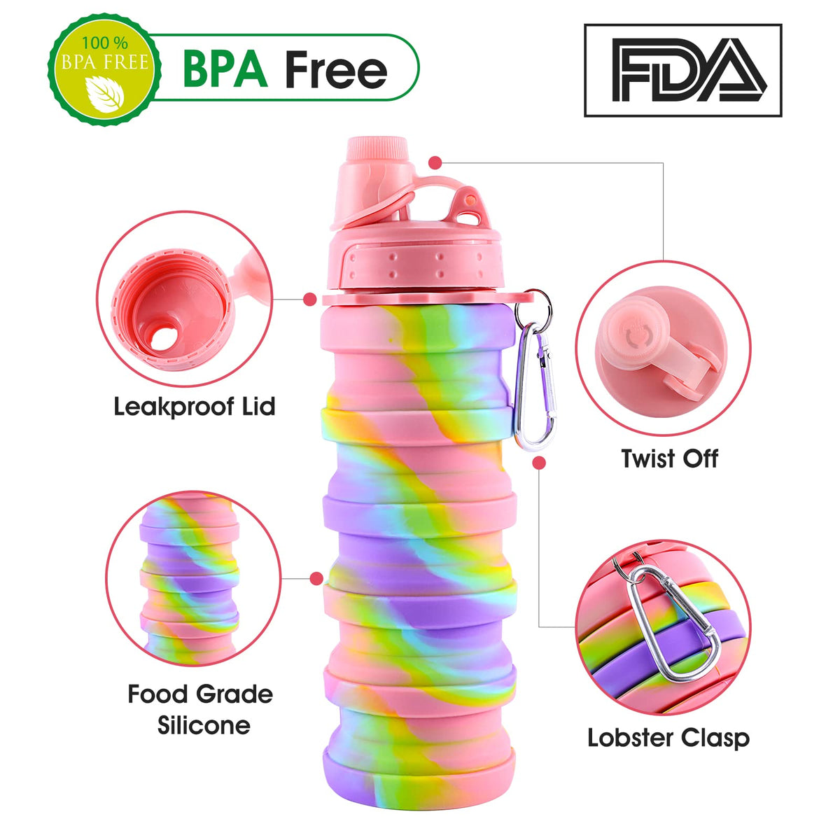 Makersland Rainbow Collapsible Folding Water Bottles For Kids, Students, Adults, Reusable Bpa Free Silicone Foldable Sports Wate