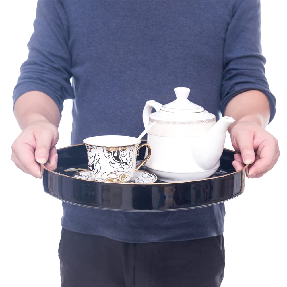 MAONAME 13'' Round Decorative Tray Marbling Plastic Tray with Handles Coffee Table Tray and Serving Tray for Ottoman Kitchen Bathroom Black