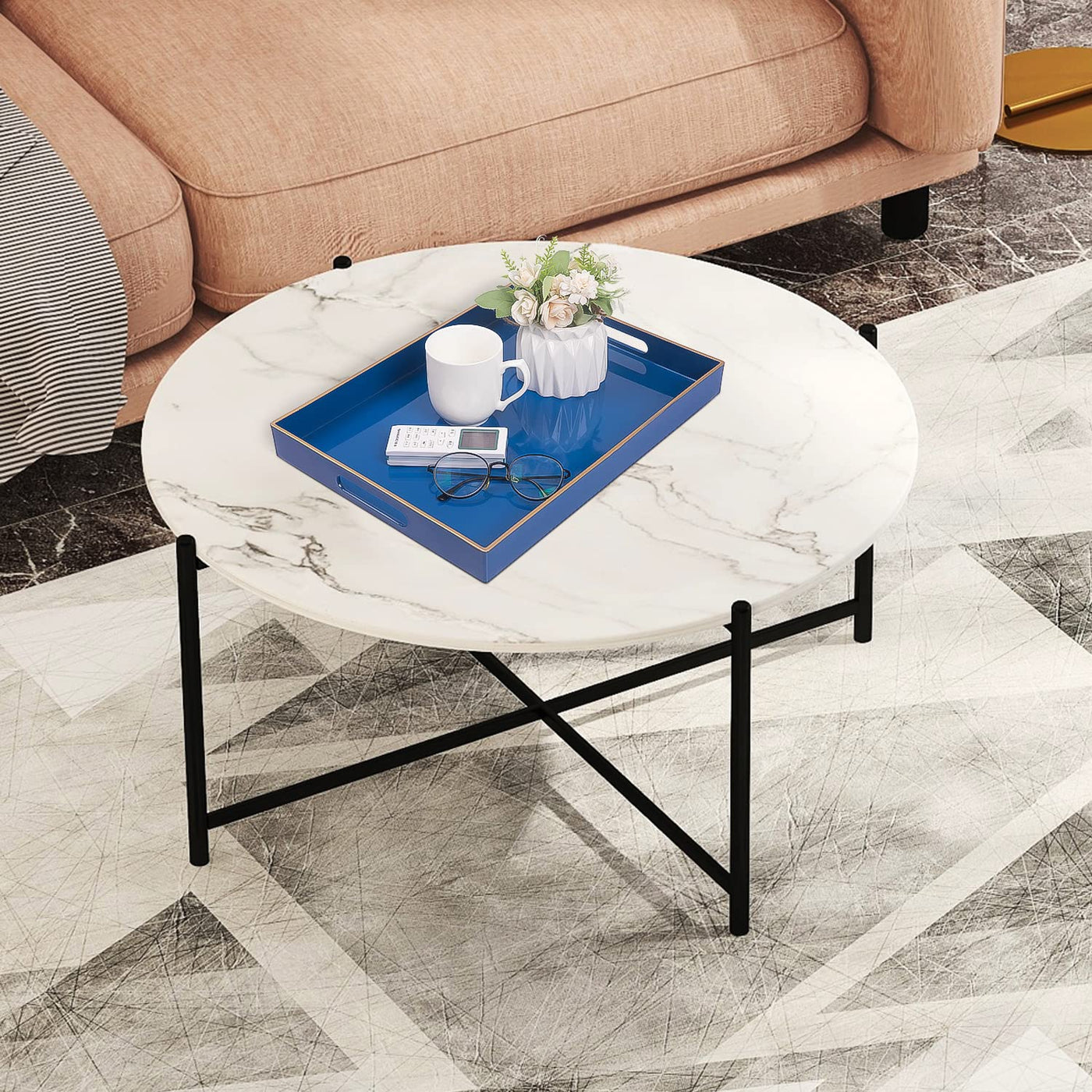 • Q: What kind of decor style does this tray complement? A: The elegant design of the tray, with its solid color and golden trim, complements modern and contemporary decor styles.