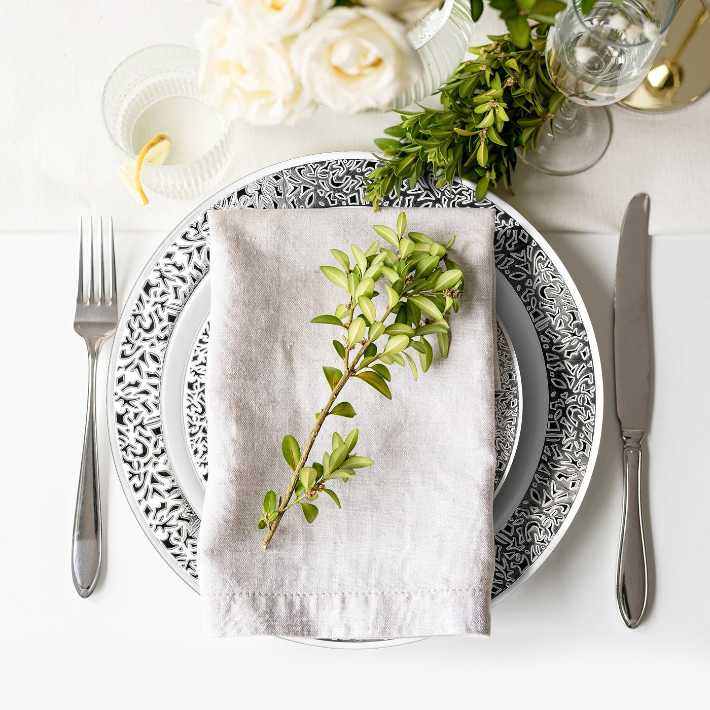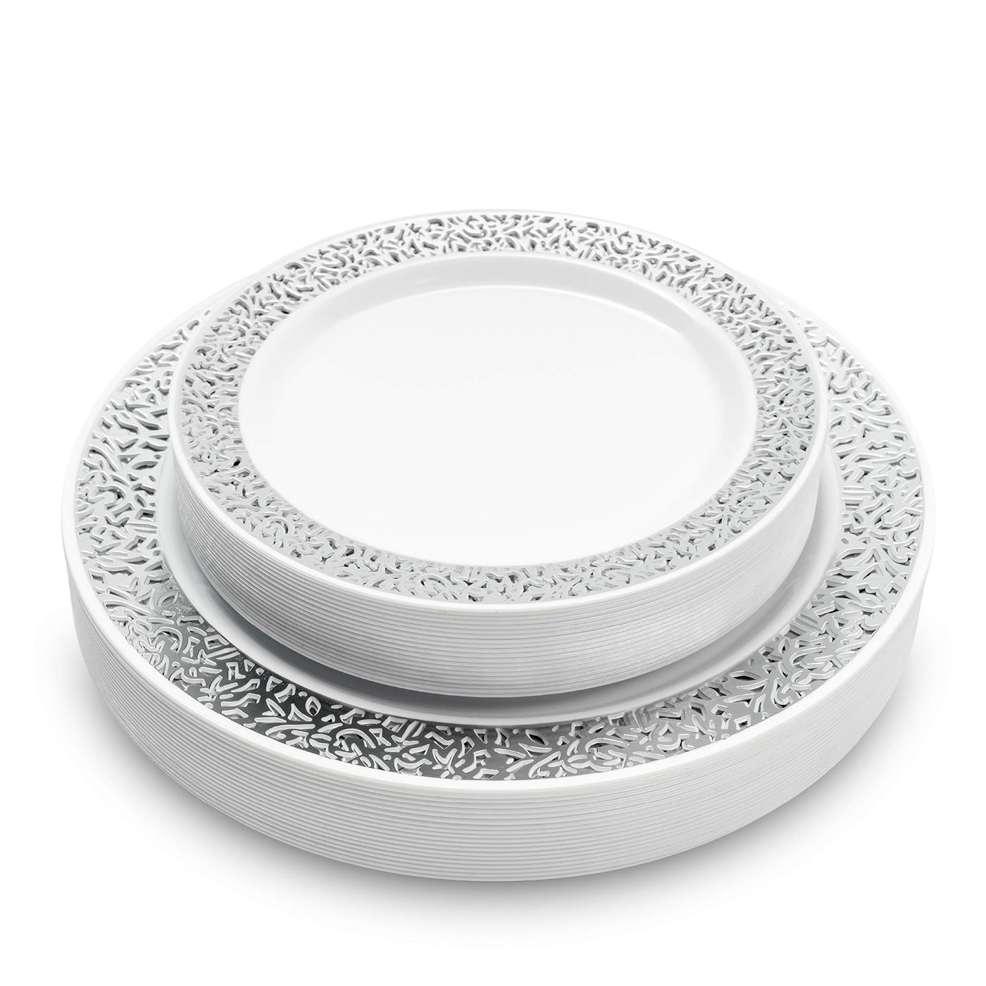 Matana 40 Sliver Plastic Plates With White & Silver Lace Trim - 20 Dinner Plates 10.25'' Inch, 20 Salad Dessert Appetizer Plates
