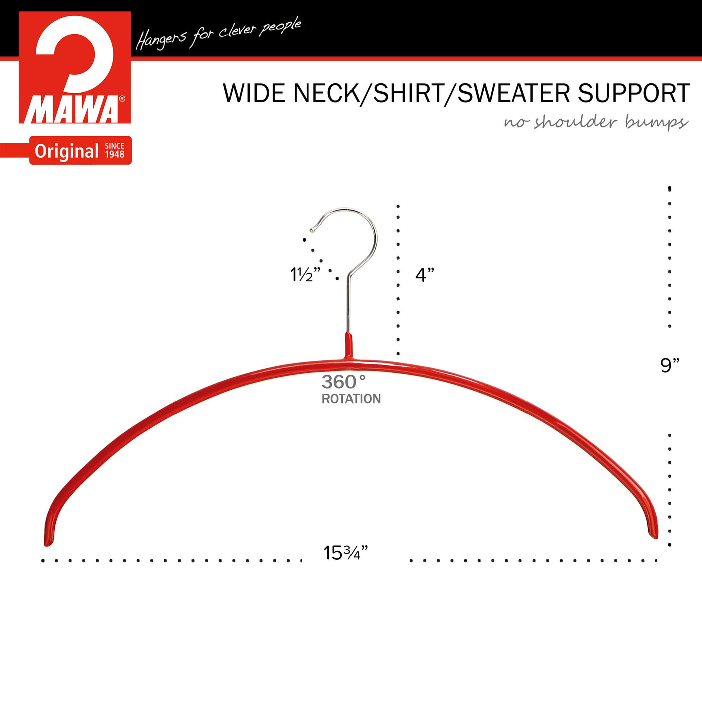 - Q: What are the dimensions of each hanger? A: Each Mawa hanger measures approximately 15 and 3/4 inches in length and 3/8 inch in thickness, making them slim and space-efficient for your closet.