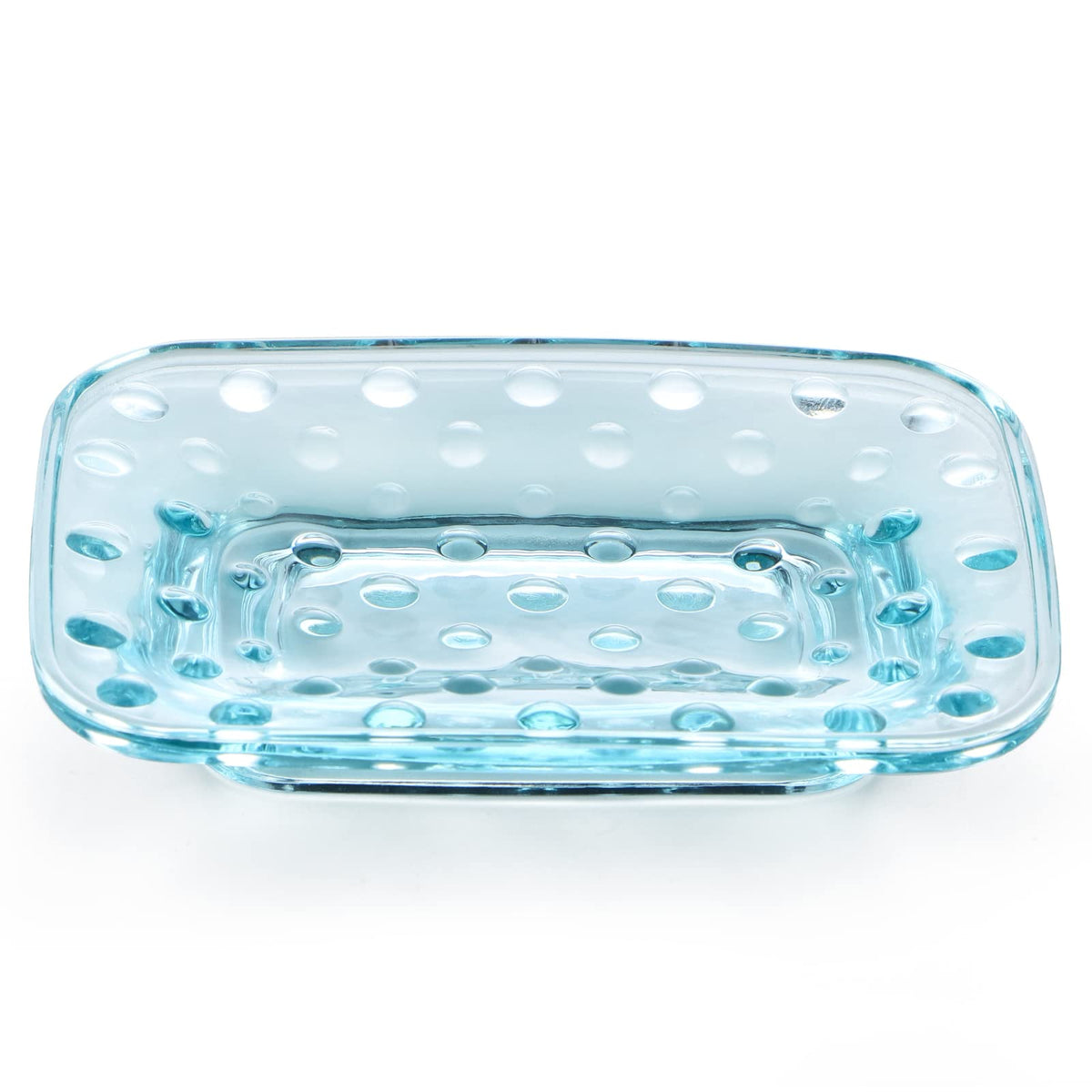 - Q: What color is the glass in the soap dish? A: The soap dish features blue colored glass with an embossed pattern, giving it an antique look.