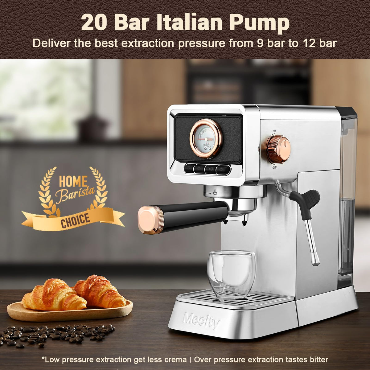 Mecity 20 Bar Espresso Machine with Milk Frother Brushed Stainless Steel Shell 37 fl.Oz Water Reservoir Coffee Maker For Espresso Latte Mocha Americano. 1400W