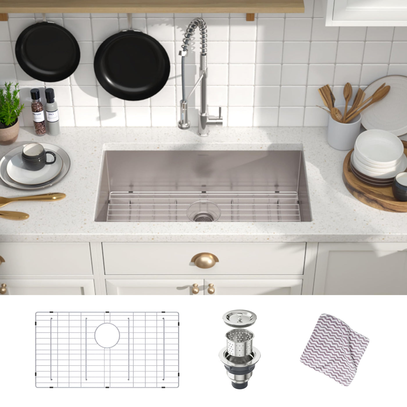 [Kitcehn Sink Outer Dimensions]: 32'' (Wide) X 19'' (Length) X 10'' (Depth). Undermount Kitchen Sink Is Sufficiently And Deeply That You Can Wash Baking Pans, Seasoning Utensils, Bakeware, Plates, Cups And Other Kitchen Items After Family And Friends Dinners. | [Sound Reduction And Shock Absorption]: The Shock Absorbing Design Of The Sink Body Keeps The Water From Splashing And The Special Coating On The Bottom Of The Sink Makes The Sound Of The Water Hitting The Sink So Small That You Can Hear Your Kids Calling Their Moms In The Bedroom While Washing Dishes In The Kitchen. | [Deflector Design]: X Grooves Design Is Easy To Drain, The Design Of The Infusion Tank So That Food Residue Along With The Flow Of Water Automatically Into The Infusion Tank, Discharge To The Water Outlet, So That We Have A Self-Cleaning Function Of The Sink When Cleaning. | [Durable Materials]: This Bar Sink Is Made Of 16 Gauge Sus304 Stainless Steel, Which Is Dent-Resistant, Extremely Durable And Has Excellent Strength For Long-Lasting Use. Wrapped In An Insulating Layer, The Bottom Of The Sink Does Not Condense Water Droplets, Keeping The Sink Cabinet Dry. And It'S Easy To Clean, Revealing A Neat Look To Ensure A Lasting Shine In Your Beautiful Kitchen. | [Easy To Install]: Our Undermount Single Bowl Kitchen Sink Is Designed To Be Easy To Install With Easy-To-Follow Installation Instructions. It Is Suitable For Both Home Diy Projects And Professional Installations.