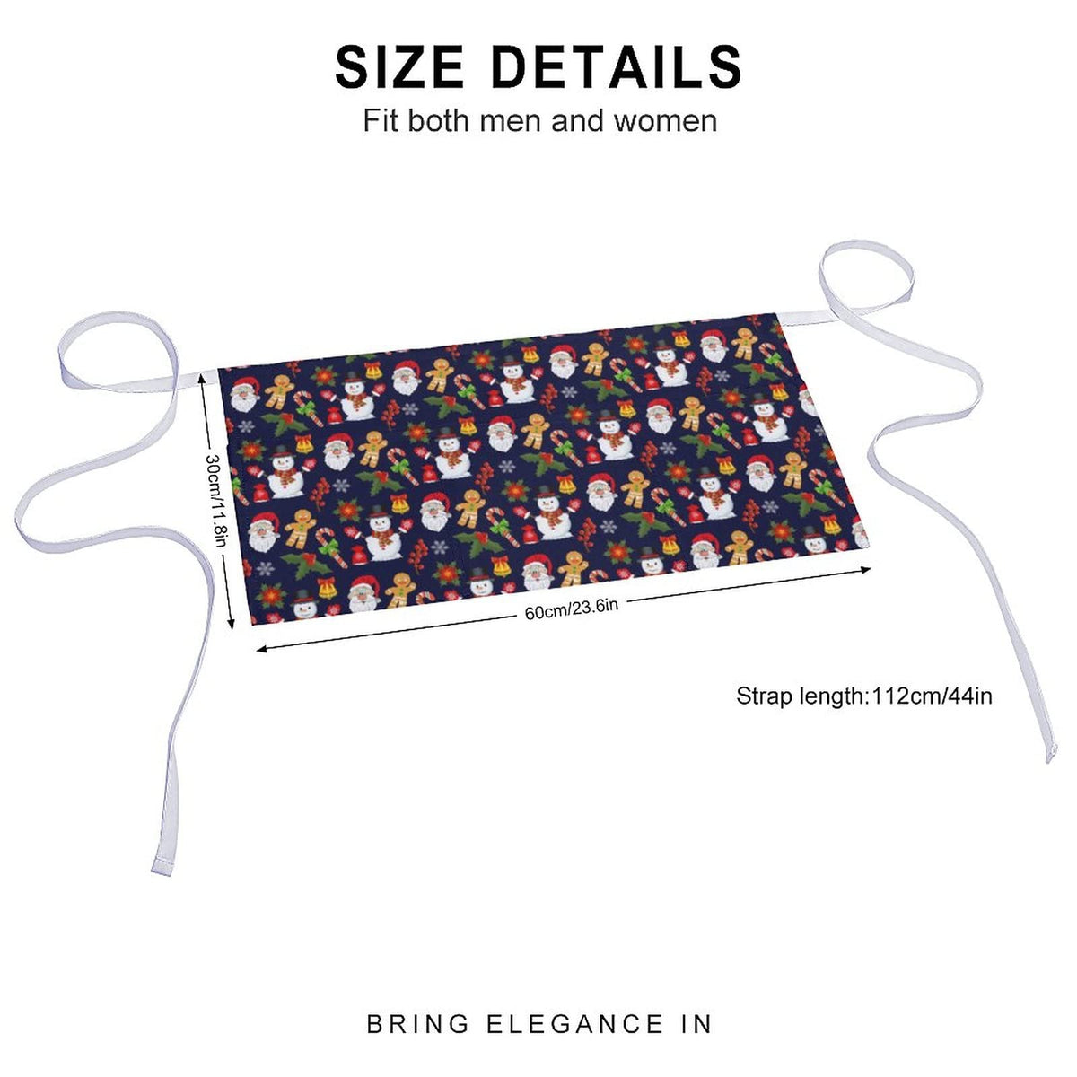 - Q: What is the size of the Merry Christmas Half Waist Apron? A: The waist apron measures 23.6 inches wide and 11.8 inches long, making it suitable for various body sizes.