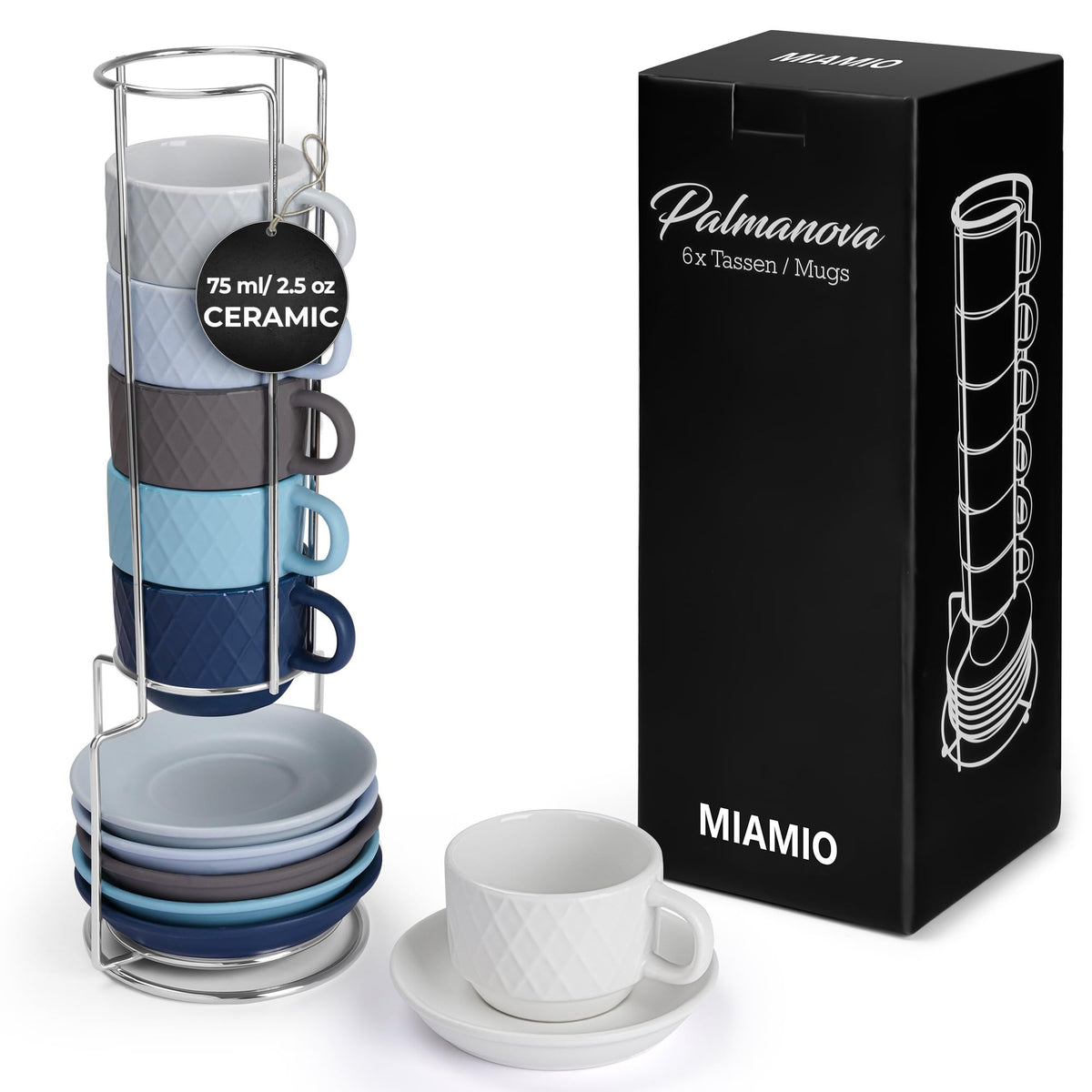 • Q: What is included in the MIAMIO espresso mug set? A: The MIAMIO espresso set includes 6 cups with a 2.5 oz volume, 6 saucers, and a metal holder.
