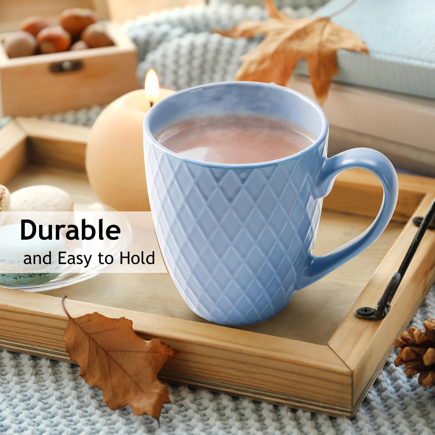 • Q: How do the handles on these mugs enhance usability? A: The mugs come with specially designed handles that provide a comfortable grip, making it easier to hold even when filled with hot beverages.