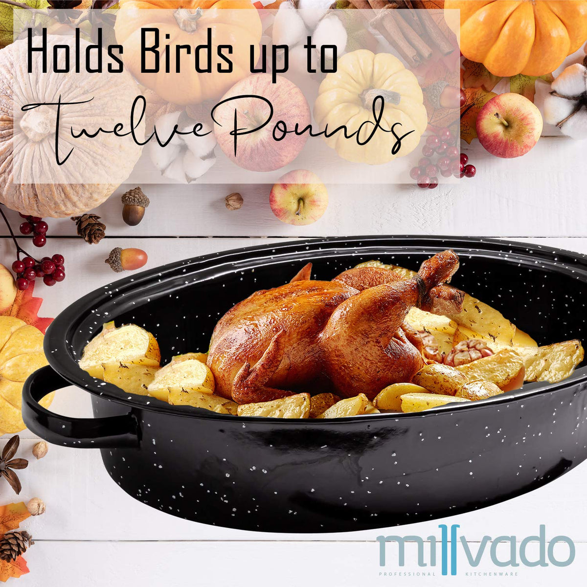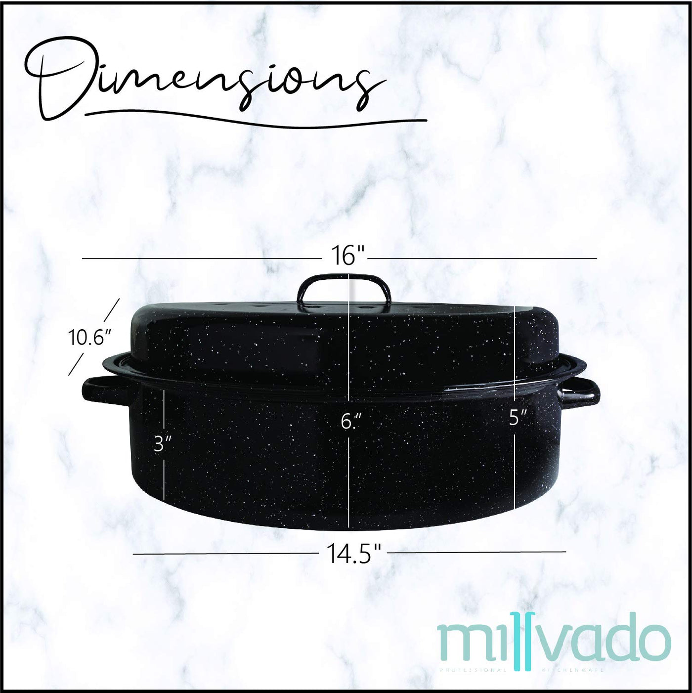 - Q: What is the size of the Millvado Granite Roasting Pan? A: The Millvado Granite Roasting Pan measures 16 inches long, 10.6 inches wide, and has 6-inch high sides, making it ideal for cooking small turkeys or roasts.