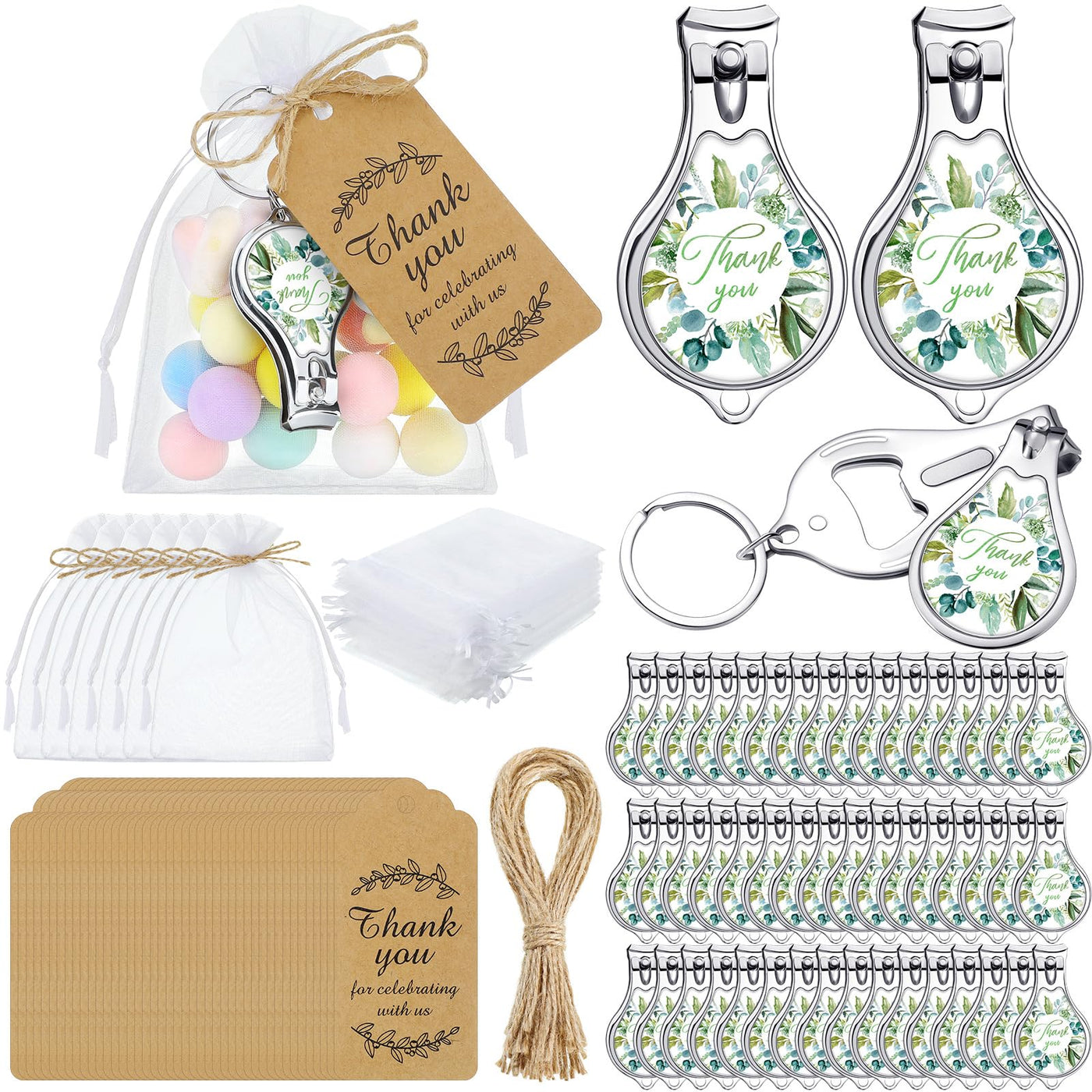 - Q: How many pieces are included in this baby shower favor set? A: The set includes 50 nail clipper keychains, 50 thank you tags, 50 organza bags, and 50 ropes.