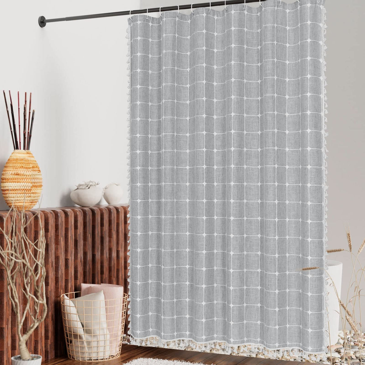 Mitovilla Grey Boho Extra Long Shower Curtain 72 X 84, Modern Farmhouse 84 Inch Xl Cotton Linen Texture Tassel Fabric Shower Cur