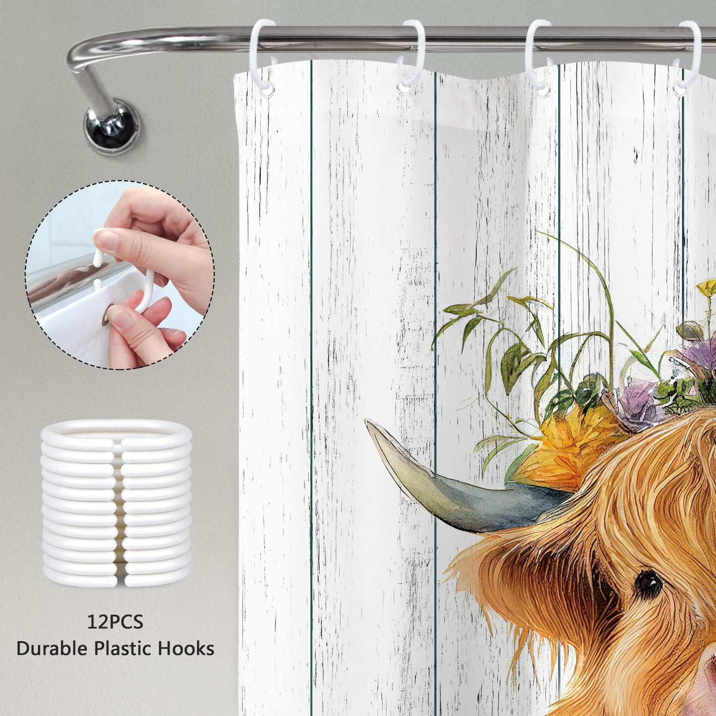 Mitpok Farmhouse Highland Cow Shower Curtain 60Wx72H Western Spring Rustic Funny Calf Country Bull Animal Wood Floral Flower Pla