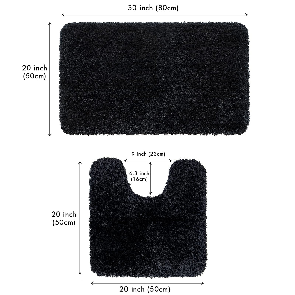 - Q: What are the dimensions of the mats included in this set? A: The set includes a bath mat measuring 20 inches by 30 inches and a U-shaped contour toilet rug measuring 20 inches by 20 inches.