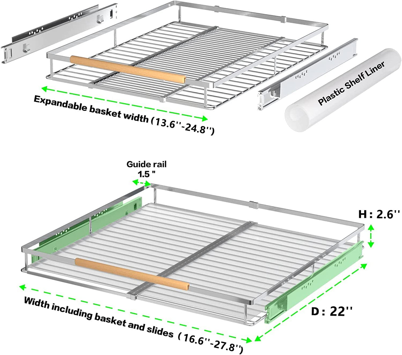 • Q: What are the dimensions of the MIYUPTC Expandable Sliding Basket? A: The MIYUPTC Expandable Sliding Basket can expand from 16.6 inches to 27.8 inches in width, has a depth of 22 inches, and a height of 2.6 inches.