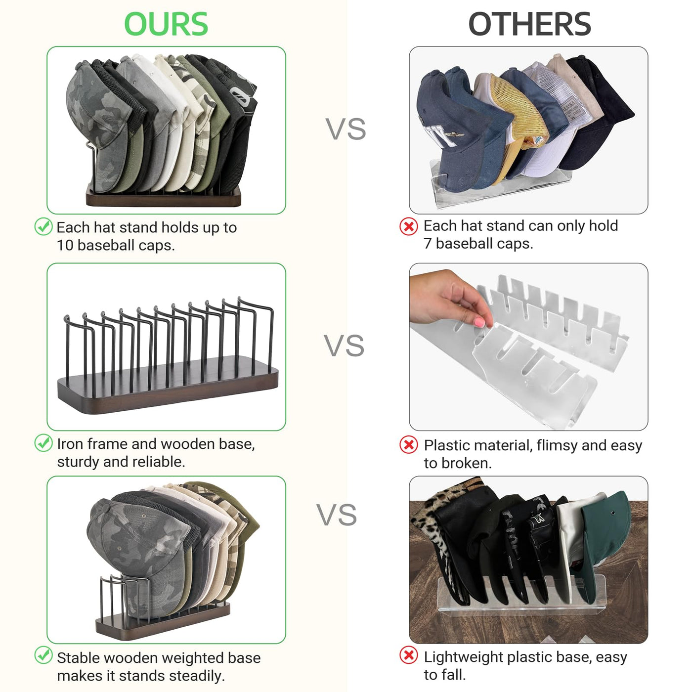 - Q: How many baseball caps can this organizer hold? A: This hat organizer can hold up to 10 baseball caps, displaying them upright for easy access.