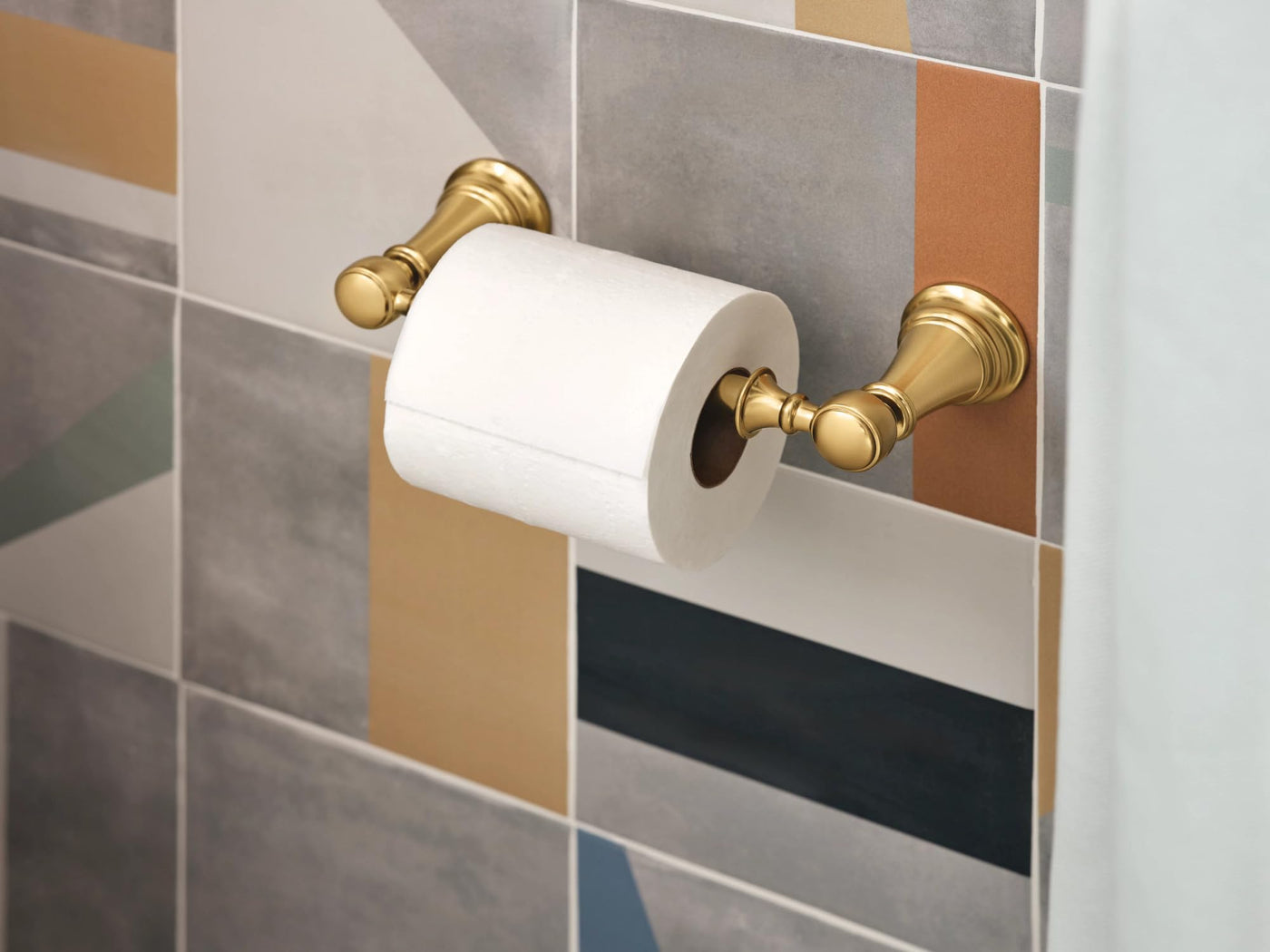 • Q: What is the finish of the Moen Weymouth Toilet Paper Holder? A: The Moen Weymouth Toilet Paper Holder features a brushed gold finish that adds a touch of sophistication to any bathroom.