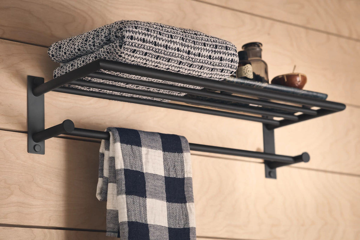 Moen Y5794Bl 24-Inch Wide Modern Bathroom Hotel-Style Towel Storage Shelf With Towel Bar, Matte Black