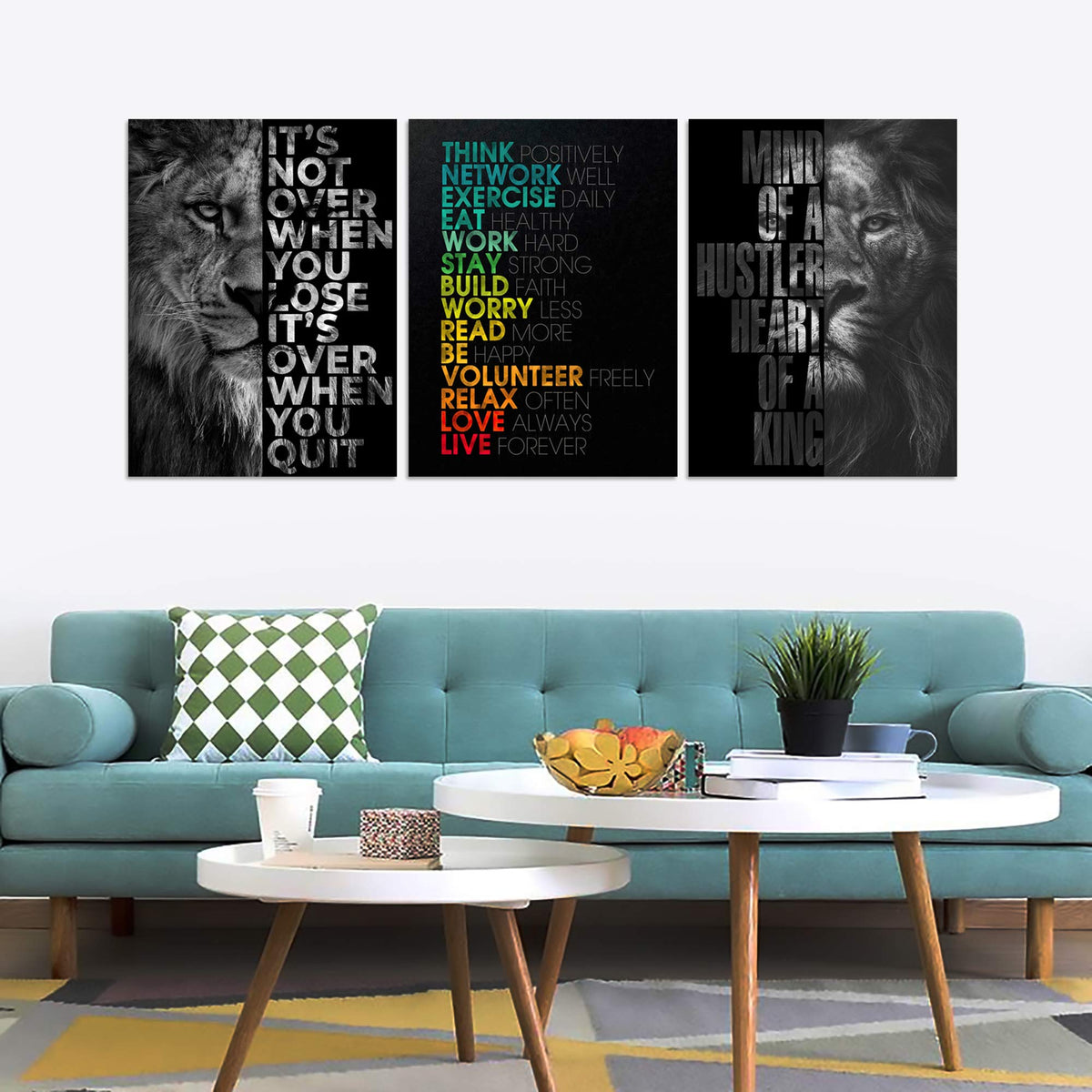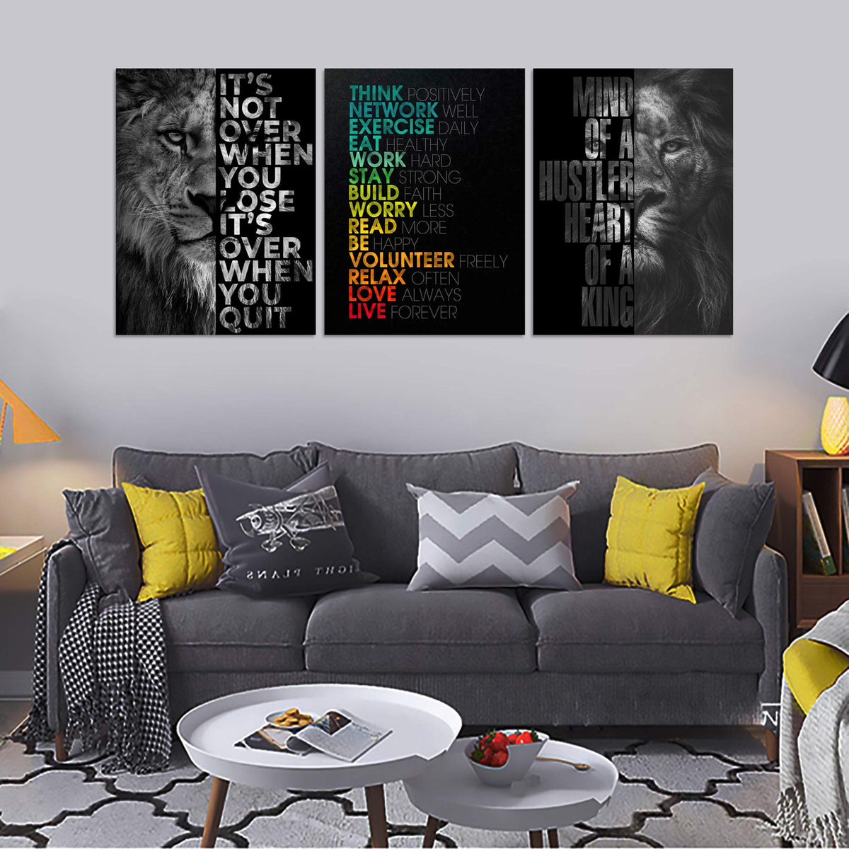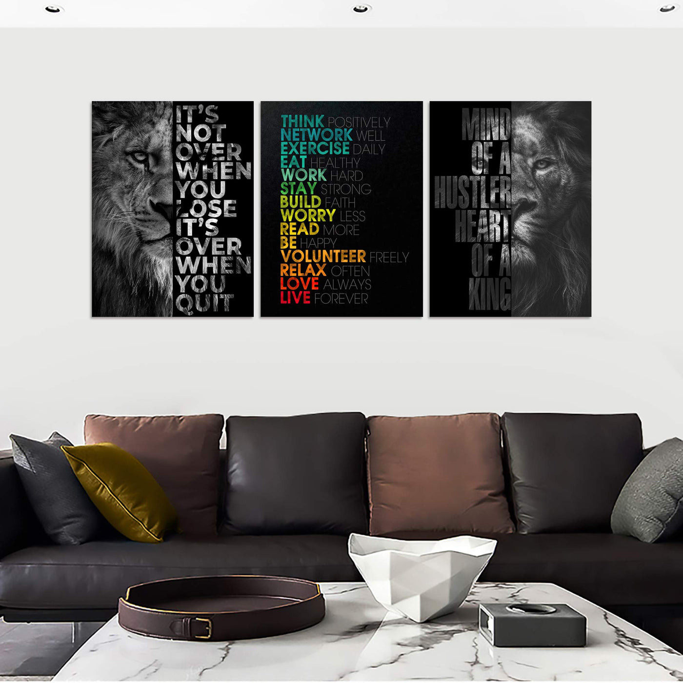 - Q: What are the dimensions of the Motivational Office Wall Decor? A: The total dimension of the artwork is 48 inches wide by 24 inches high, consisting of 3 separate canvases. Each panel measures 16 inches wide by 24 inches high.